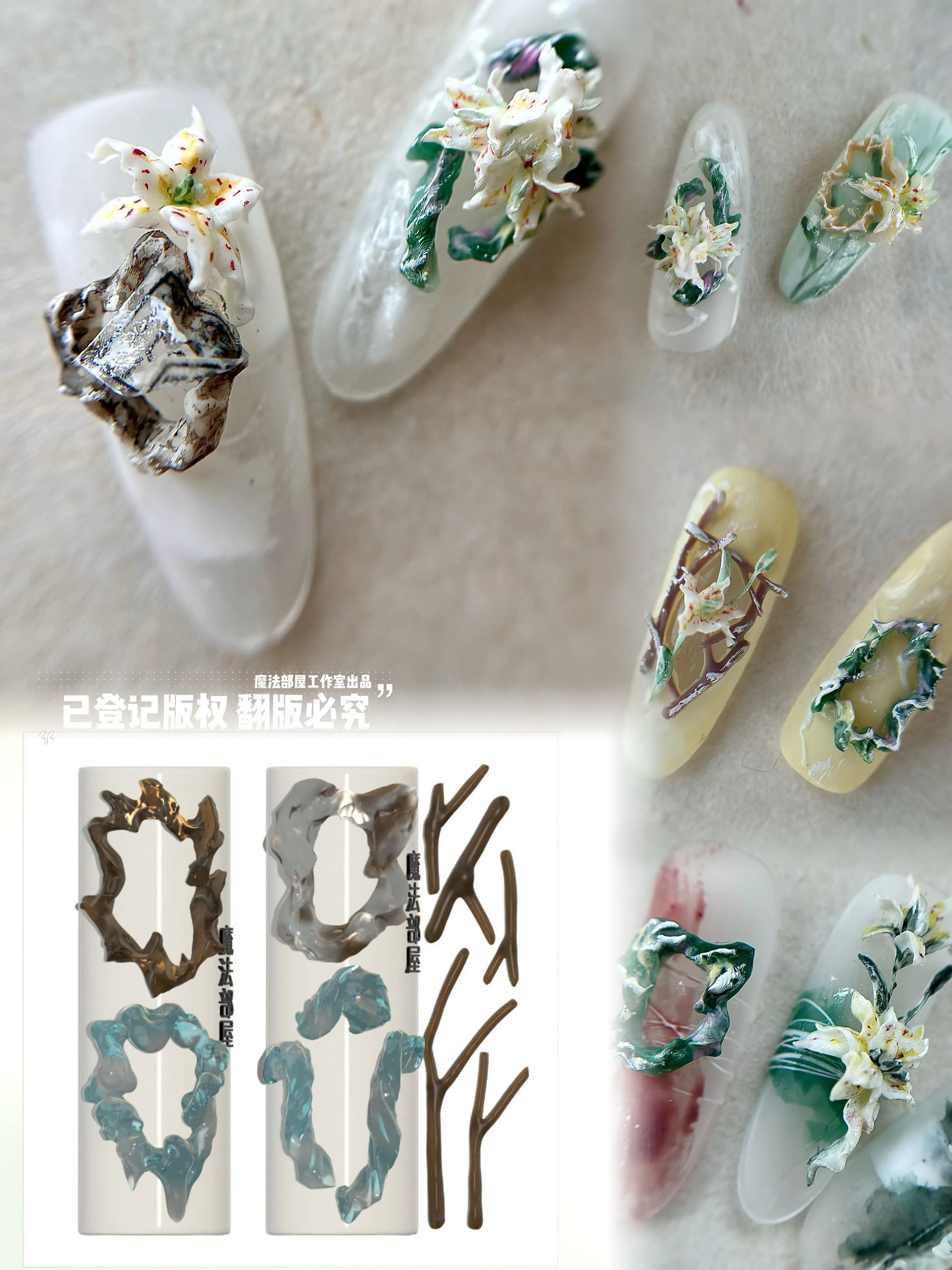 Ideal for the beginners expecting real results • To make you own nail design more easier. • Material: silicon    • How to use : A,clean the mould B,put the color gel into the mould. C,put the mould into the UV lamp and curing it. D,take out the gel when it gets dried E,stick the art piece to the nail If make 3D acrylic nails, pls use acrylic powder and only need step A,B,D,E.