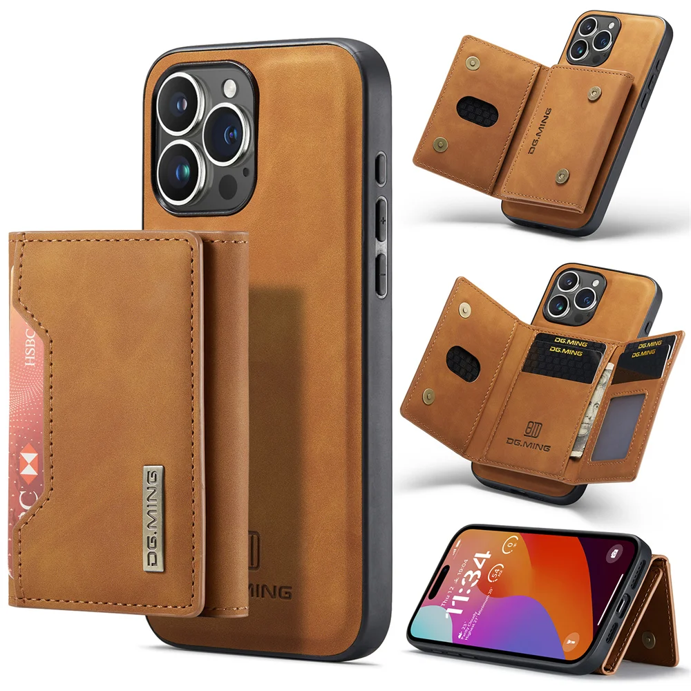 Color: Coffee, Material: leather - 2 In 1 Case For iPhone 16 15 14 13 12 11 Pro Max Plus XS Max XR 8 Plus SE 2022 Wallet Magnetic Leather Card Holder Pocket Cover