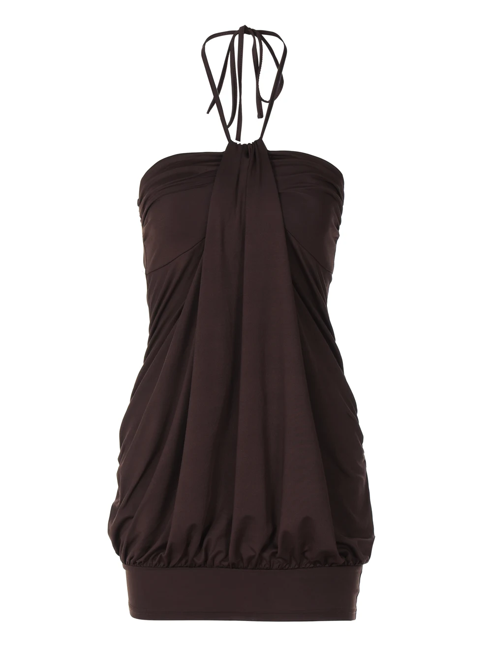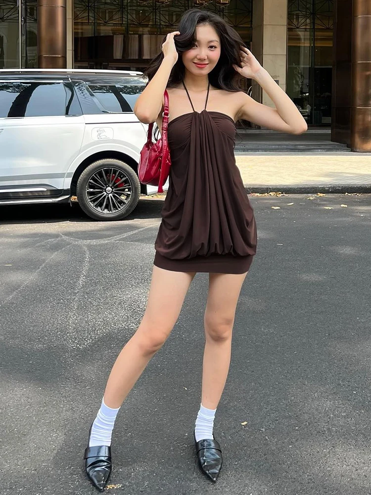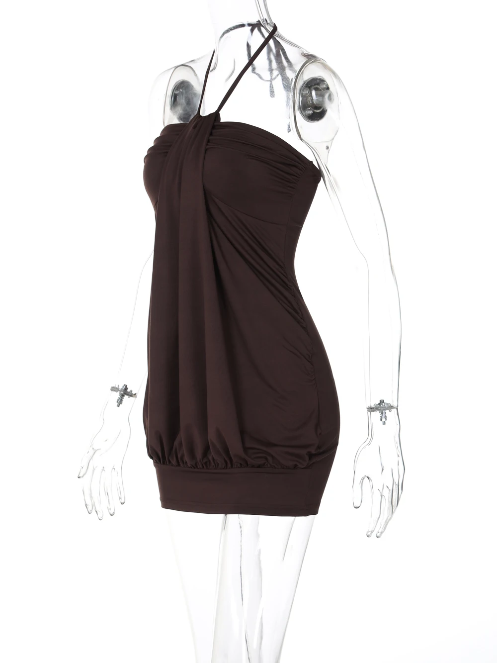 Color: Coffee, Size: L - Dulzura Sexy Mini Halter Ruched Backless Short Dress Solid Sleeveless Women Dresses Summer Lady Party Birthday Club Clothes Y2K