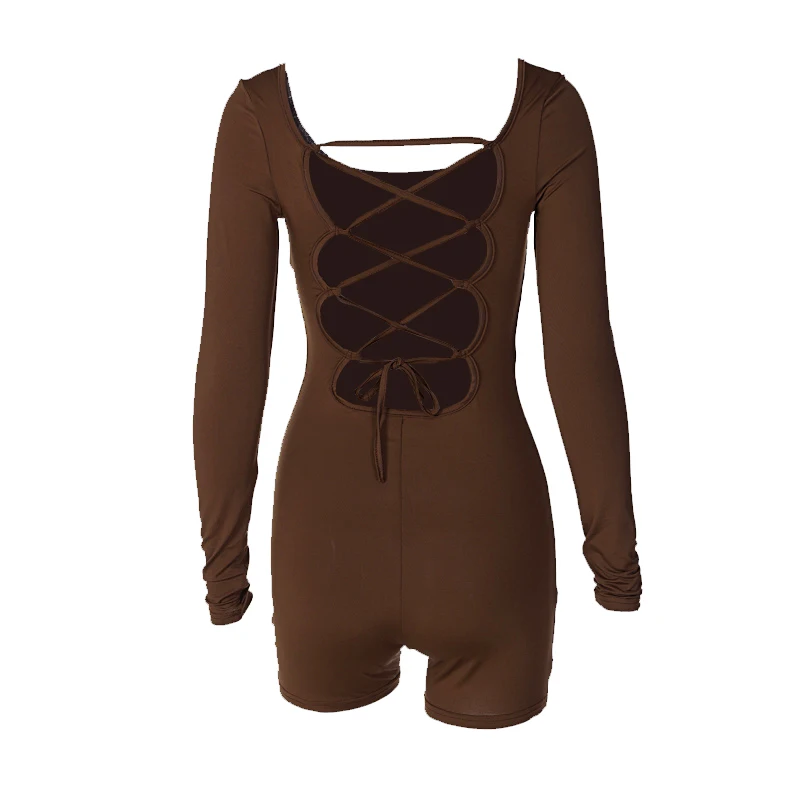 Color: Coffee, Size: S - 2025 Summer New Sexy Long-Sleeved U-Neck Tethered Straps Backless Butt-Lifting Yoga Jumpsuit Tight Women's Jumpsuit