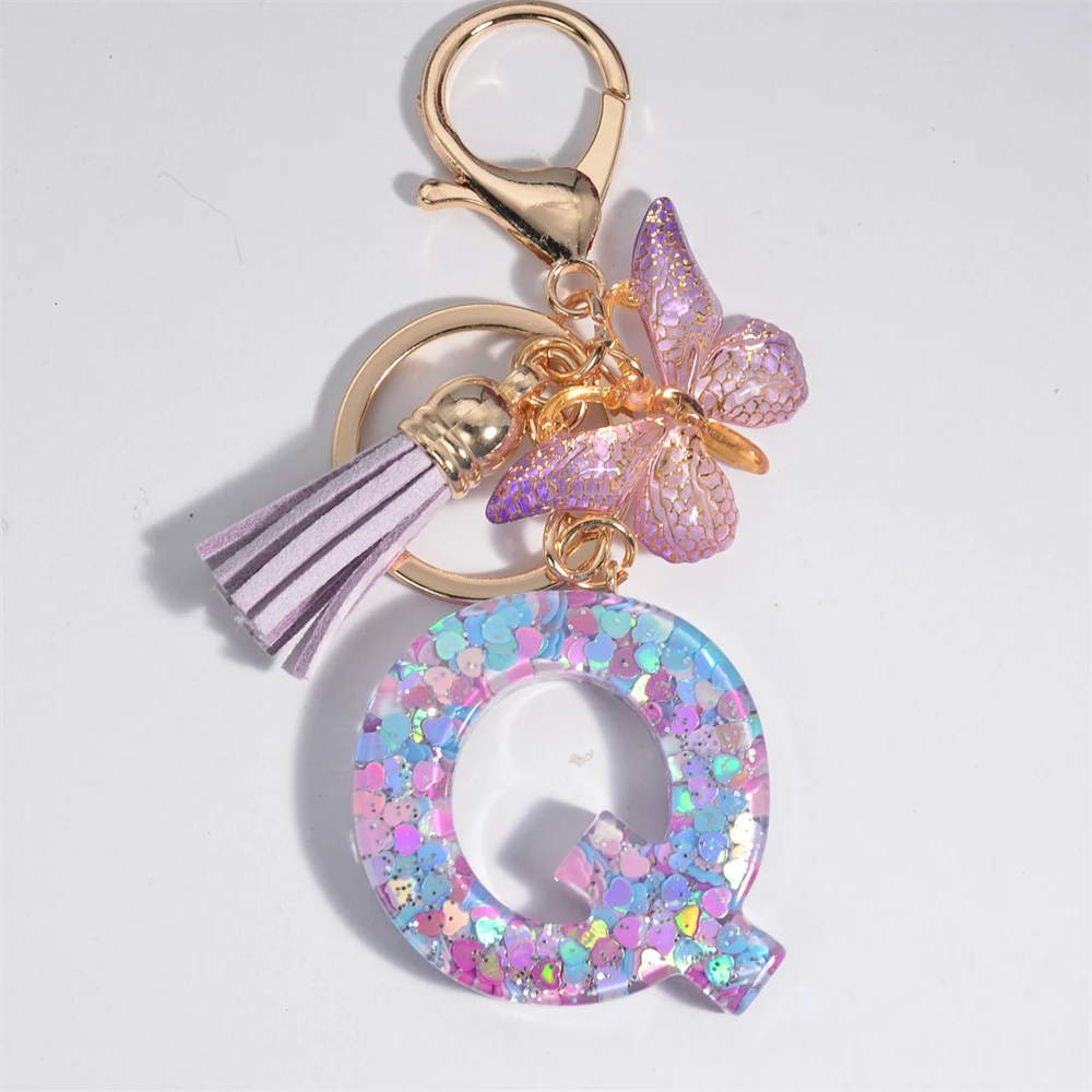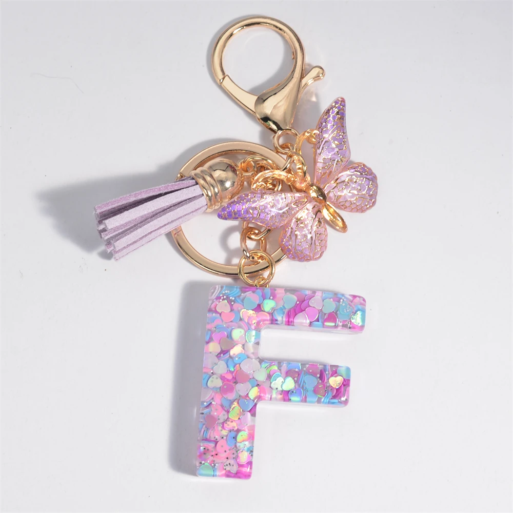 Color: Dark Brown - Fashion Tassel Butterfly 26Letter Keychain Colorful Love Heart Filled Resin Alphabet Keyring Women Girls Car Bag Phone Pendant