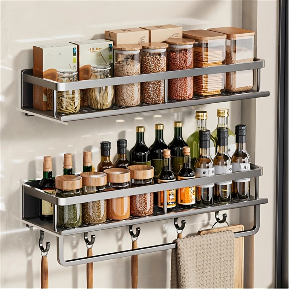 Color: DARK GRAY - Multifunctional Kitchen and Bath Tray Wall-Mounted Aluminum Storage Rack Seasoning Bottle Storage Shelf Kitchen Storage Hooks