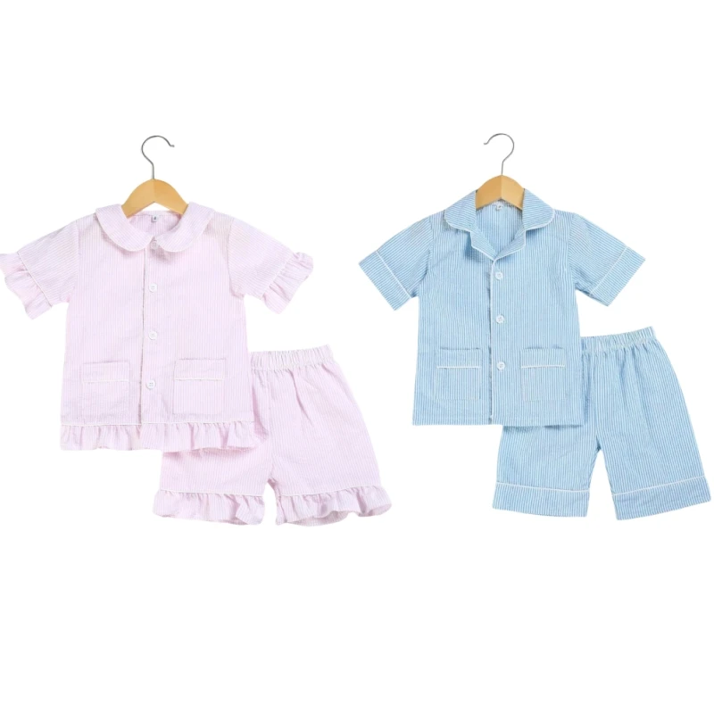1-12T Summer Baby Pajamas 100% Cotton Seersucker Soft Sibling Matching Sleepwear Kids Clothes Home Wear Girls Boys Pyjamas Sets