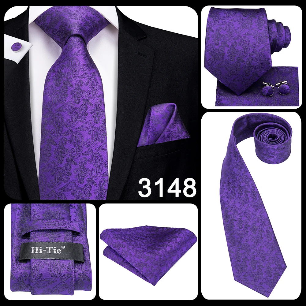 Hi-Tie Purple Paisley Silk Elegent Tie for Men Novelty Design Handky cufflink Tie Set Party Business Wedding Dropshipping