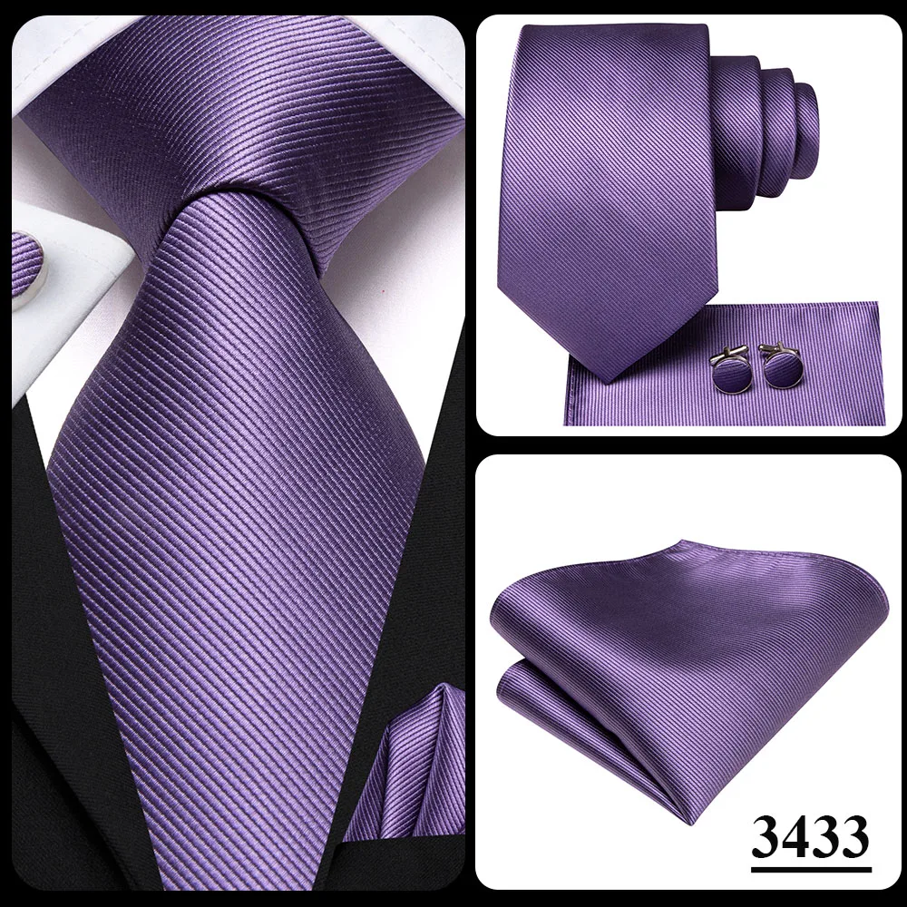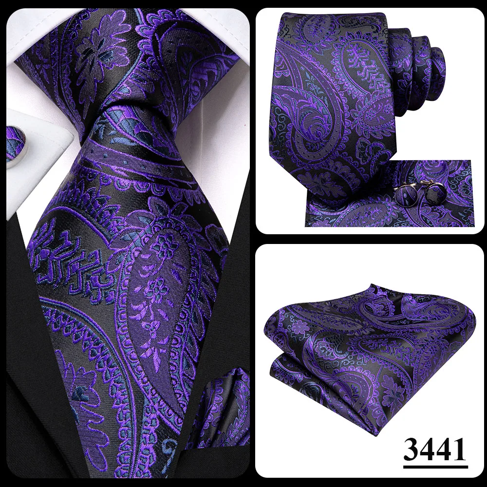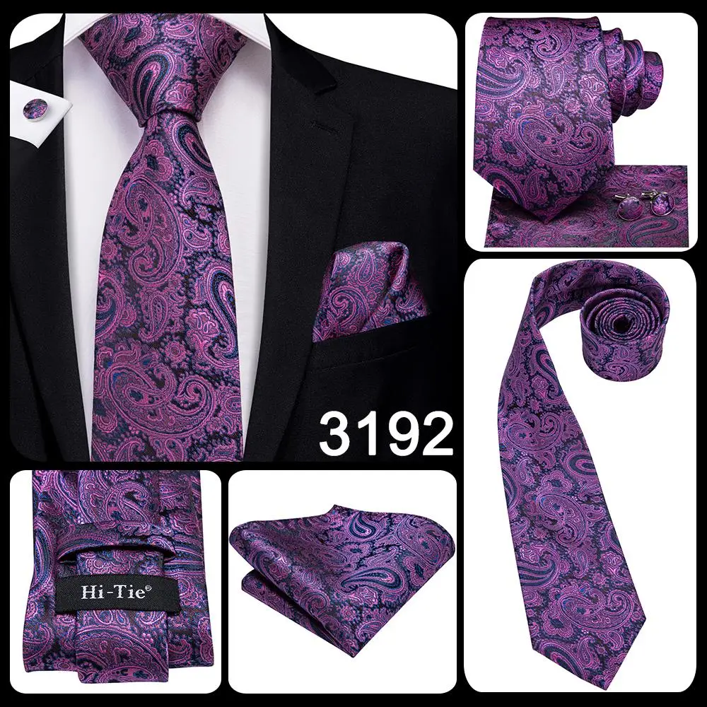 Color: Fuchsia - Hi-Tie Purple Paisley Silk Elegent Tie for Men Novelty Design Handky cufflink Tie Set Party Business Wedding Dropshipping