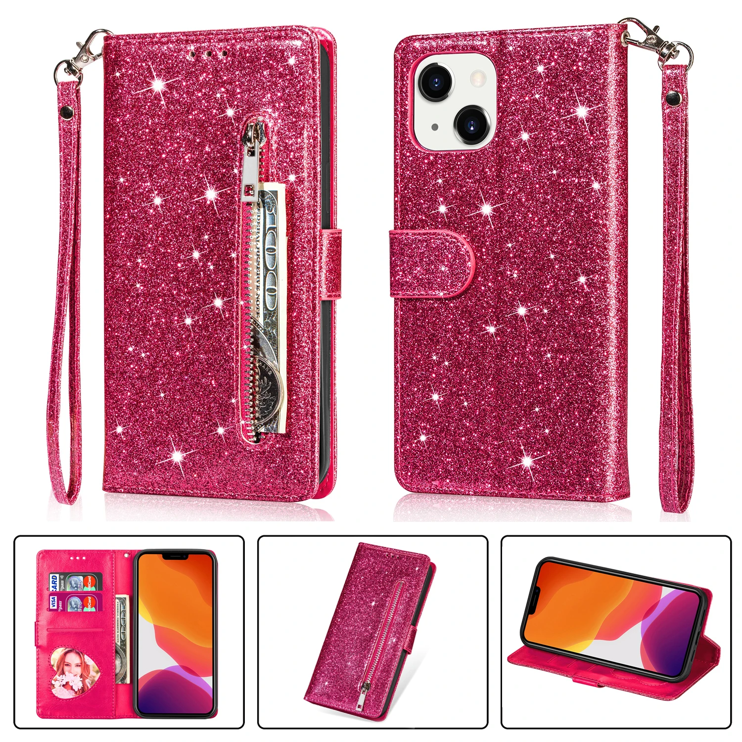 Color: Gold, Material: PC + TPU - Zipper Flip Wallet Glitter Leather Case for iPhone 16 15 14 13 12 11 Pro Max XS XR 8 7 Plus SE 2022 Mini Bling Stand Phone Cover