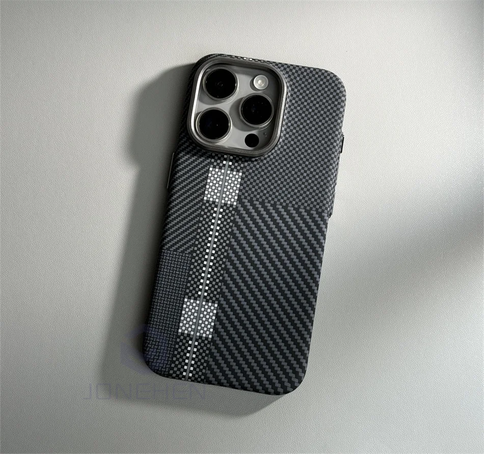 Color: Gold, Material: PP - Luxury Alloy Lens Personalized Pixel 3D Relief Carbon Fibre Pattern Case For iPhone 13 14 15 16 Pro Max Slim Cover For Magsafe