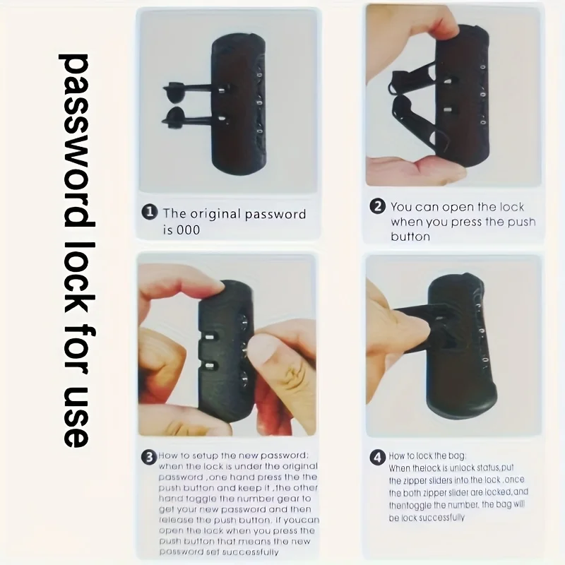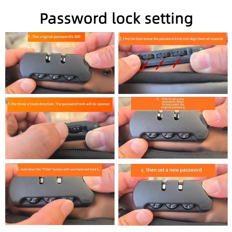 1、The initial password for the password lock of this product is "000". If the initial password is incorrect after receiving the product and the password lock cannot be opened, you can find the small hole below the password lock knob and align them all to the three o'clock direction. The password lock can be opened normally, and after opening, you can set a new password for the password lock to use. You can follow the steps in the picture or video below to operate.