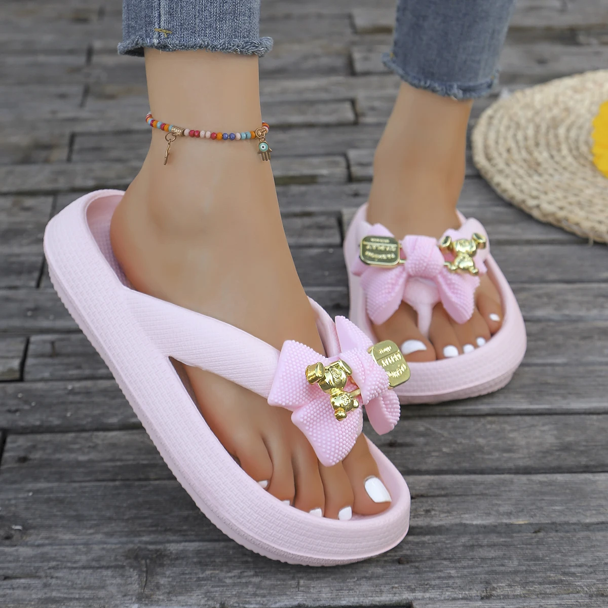 Color: Gold, Shoe Size: 36-37 - Summer Multi Color Women's Flip Flops Fashionable Metallic Teddy Bear Bow Slide Sandal Beach Vacation Home Versatile Footwear
