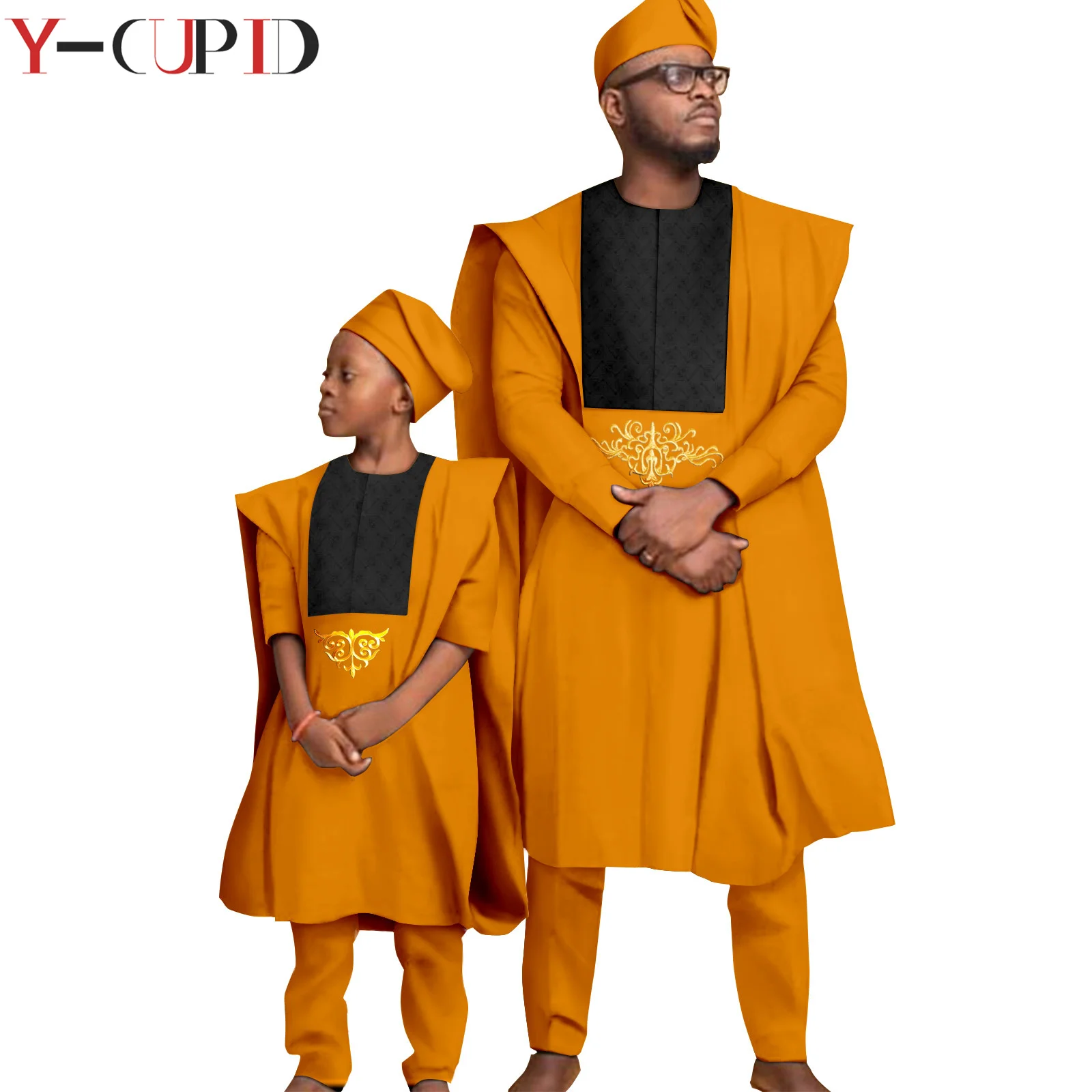 Color: Gold, Size: L - African Clothes for Men Top Pants Robes Hat Sets Match Kid Boy Sets Dashiki Father and Son Bazin Riche Family Outfits Y20F001