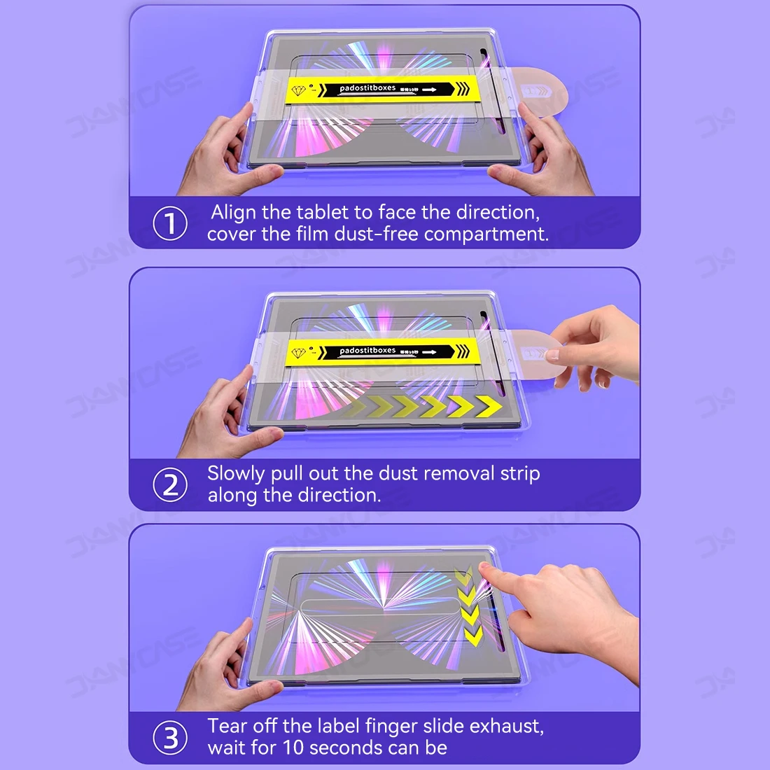 â‘ Align the tablet to face the direction, cover the film dust-free compartment.