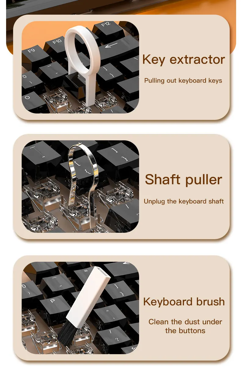 4. Deep Cleaning: The keyboard cleaning brush kit comes with a key puller. Use a key puller to remove the keycaps, then use a nylon bristle brush to clean the keyboard more thoroughly. At the same time, it is very convenient to replace the keycaps.