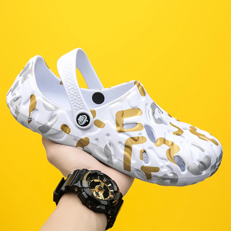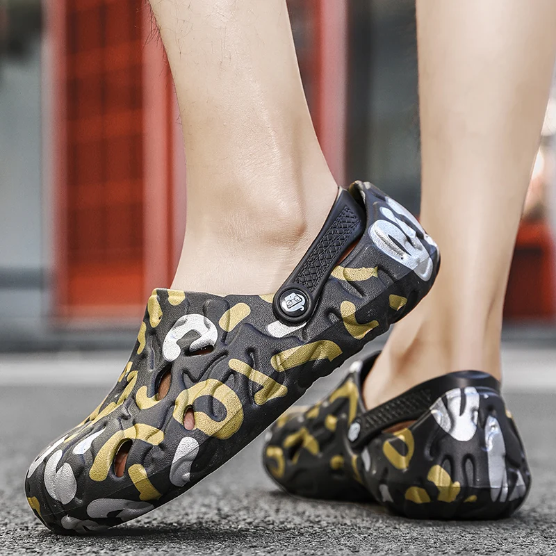 Color: GRAY, Shoe Size: 43 - Men Summer Slippers Thick Sole Mens Clogs Sandals Hollow Breathable Flip Flops Sandals Shoes Fashion Beach Slippers