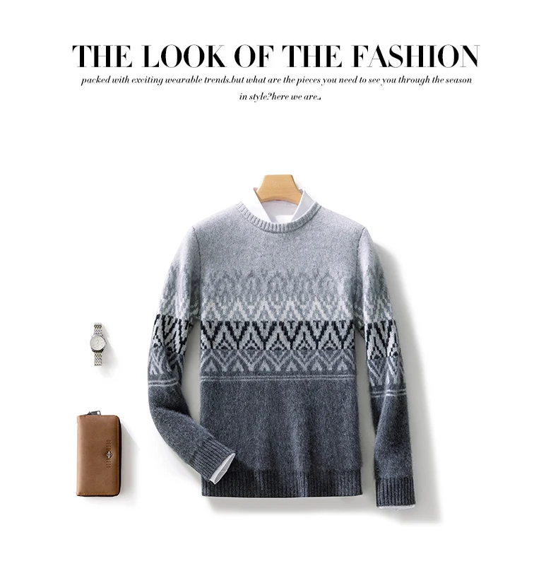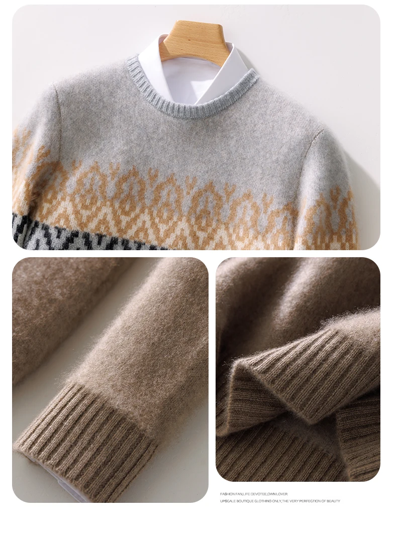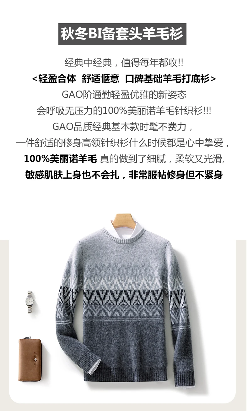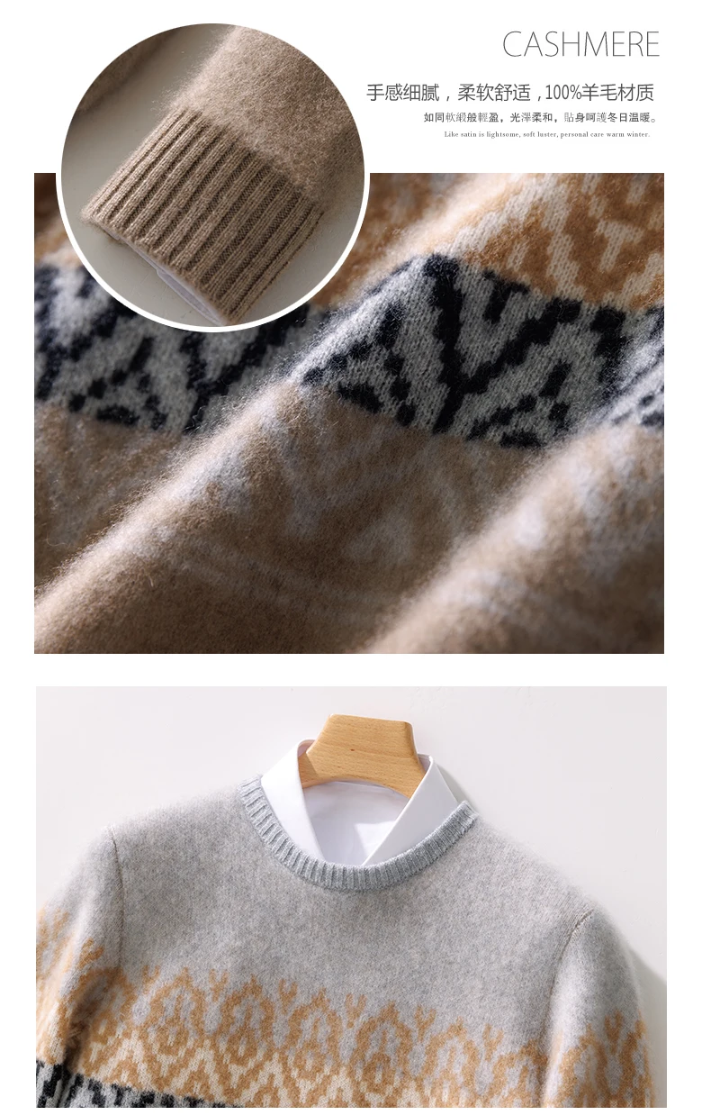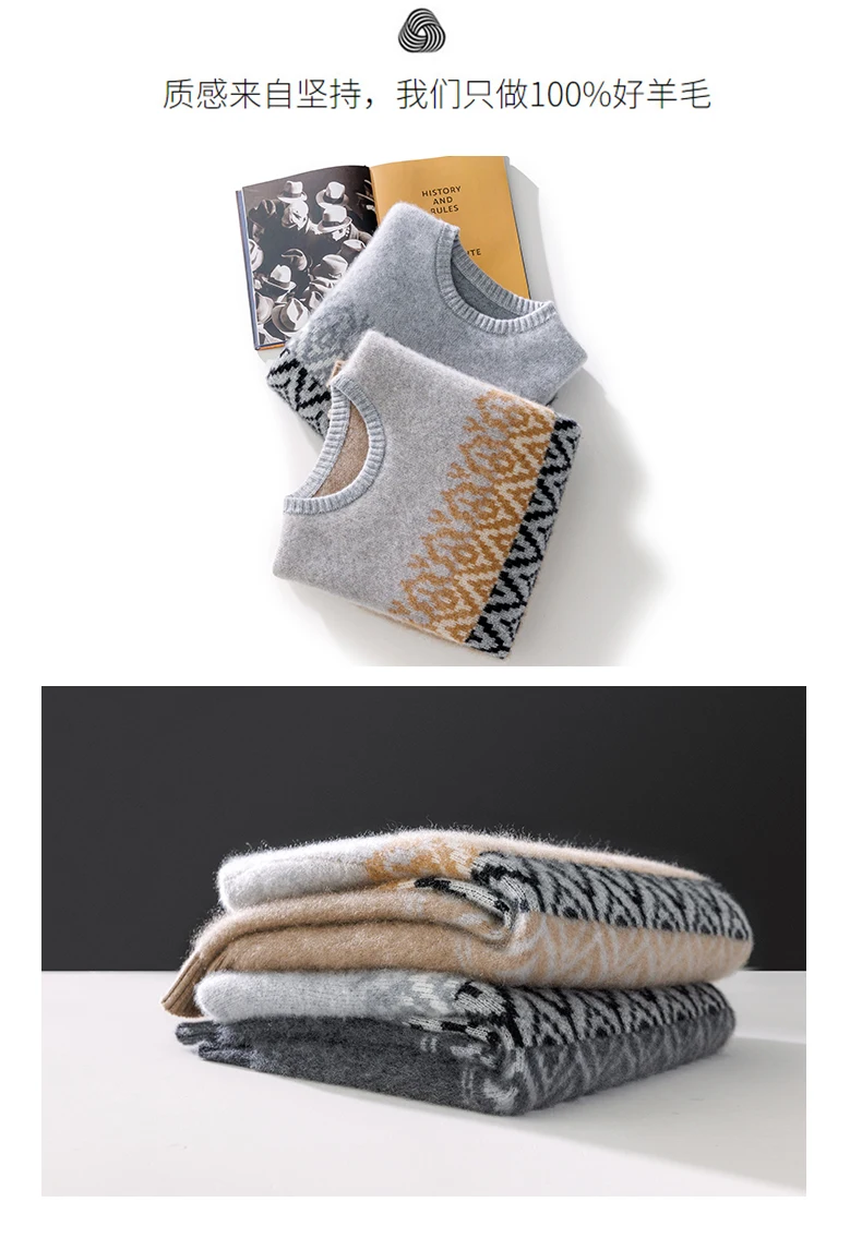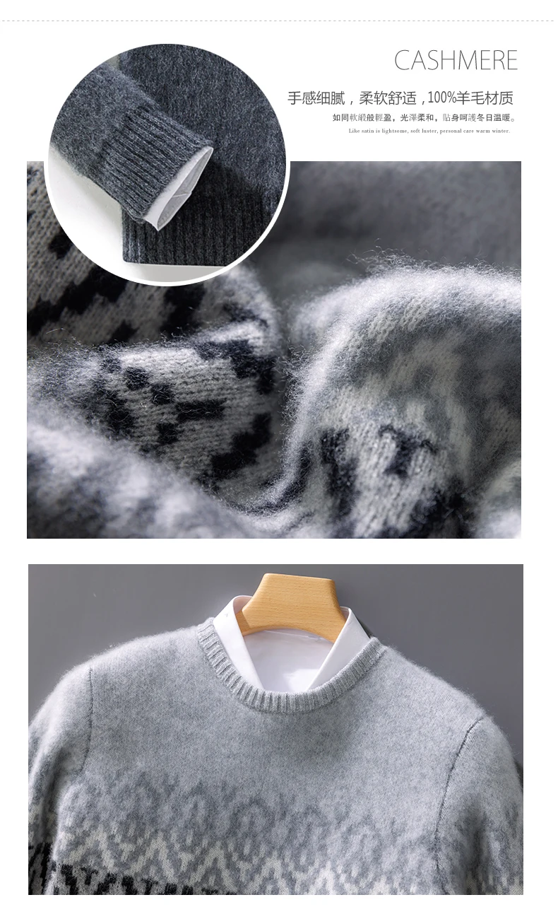 Color: GRAY, Size: L - 100% Pure Wool Pullover Sweater Men's Round Neck Knitted Sweater Autumn Winter Thick Warm Ethnic Style Men's Clothing