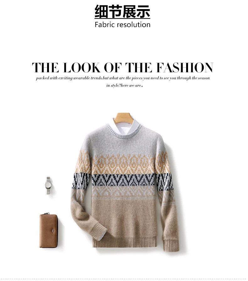 Color: GRAY, Size: S - 100% Pure Wool Pullover Sweater Men's Round Neck Knitted Sweater Autumn Winter Thick Warm Ethnic Style Men's Clothing