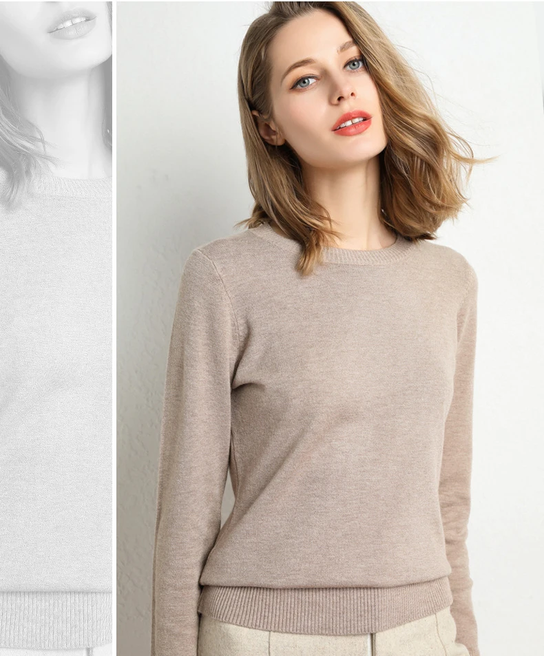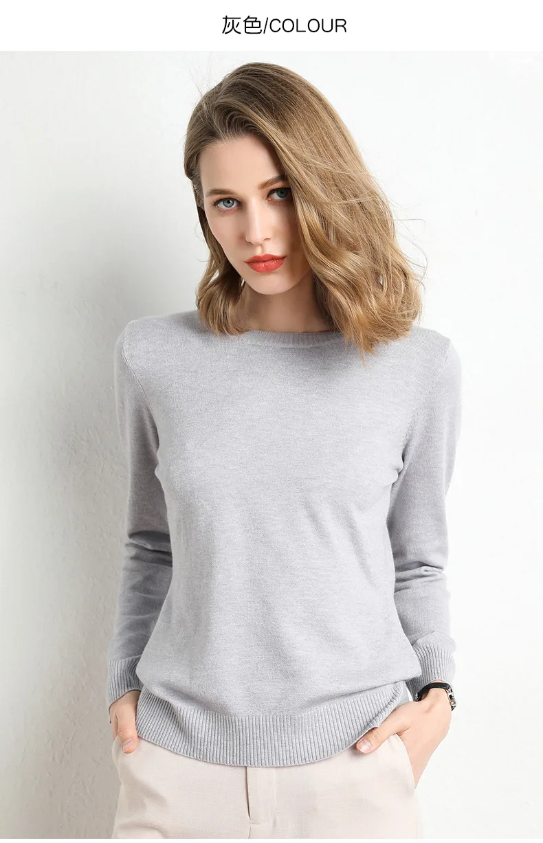 Color: GRAY, Size: S - Women Slim O-Neck Solid Pullover Cashmere Wool Blending Sweater Autumn And Winter Long-Sleeved Knit Bottoming Shirt Large Size