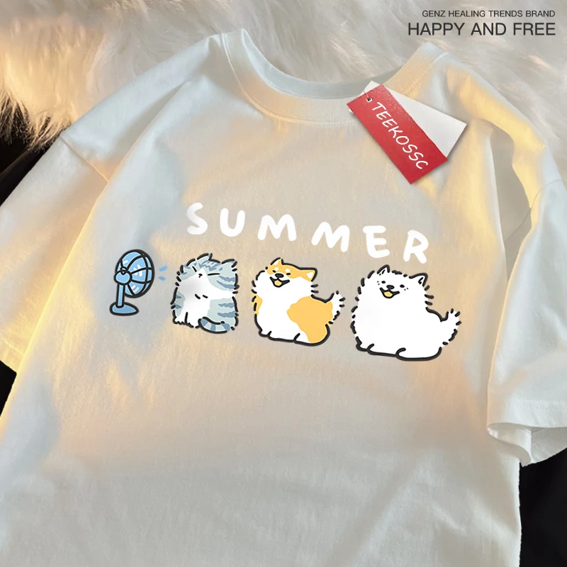 Color: GRAY, Size: XXXL - Cats And Dogs Blowing Fans Print T Shirts Men Women Cute Crewneck Clothes Loose Summer T-Shirts Fashion Cotton Short Sleeve