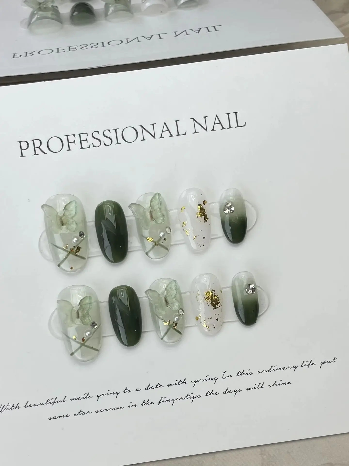 Color: Green - 10 pcs Luxury Handmade Press on Nails Middle Ellipse Lvye Elf Design False Nails with 4-PIECE Tool Adhesive Nail Glue Tabs