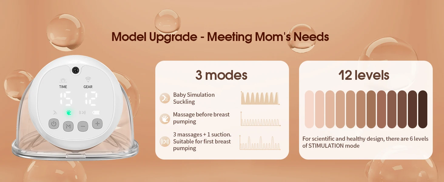 Experience comprehensive care with the upgraded Totmizby breast pump featuring 12 gears instead of the previous 9,providing more detailed options for sensitive moms.Choose from one of three modes - Suction,Massage and Stimulation - for effortless and painless pumping at any time or place.