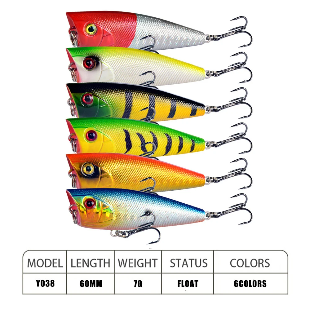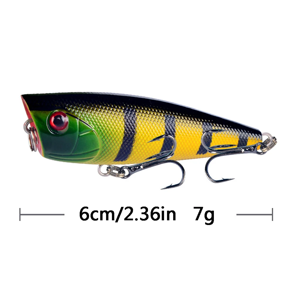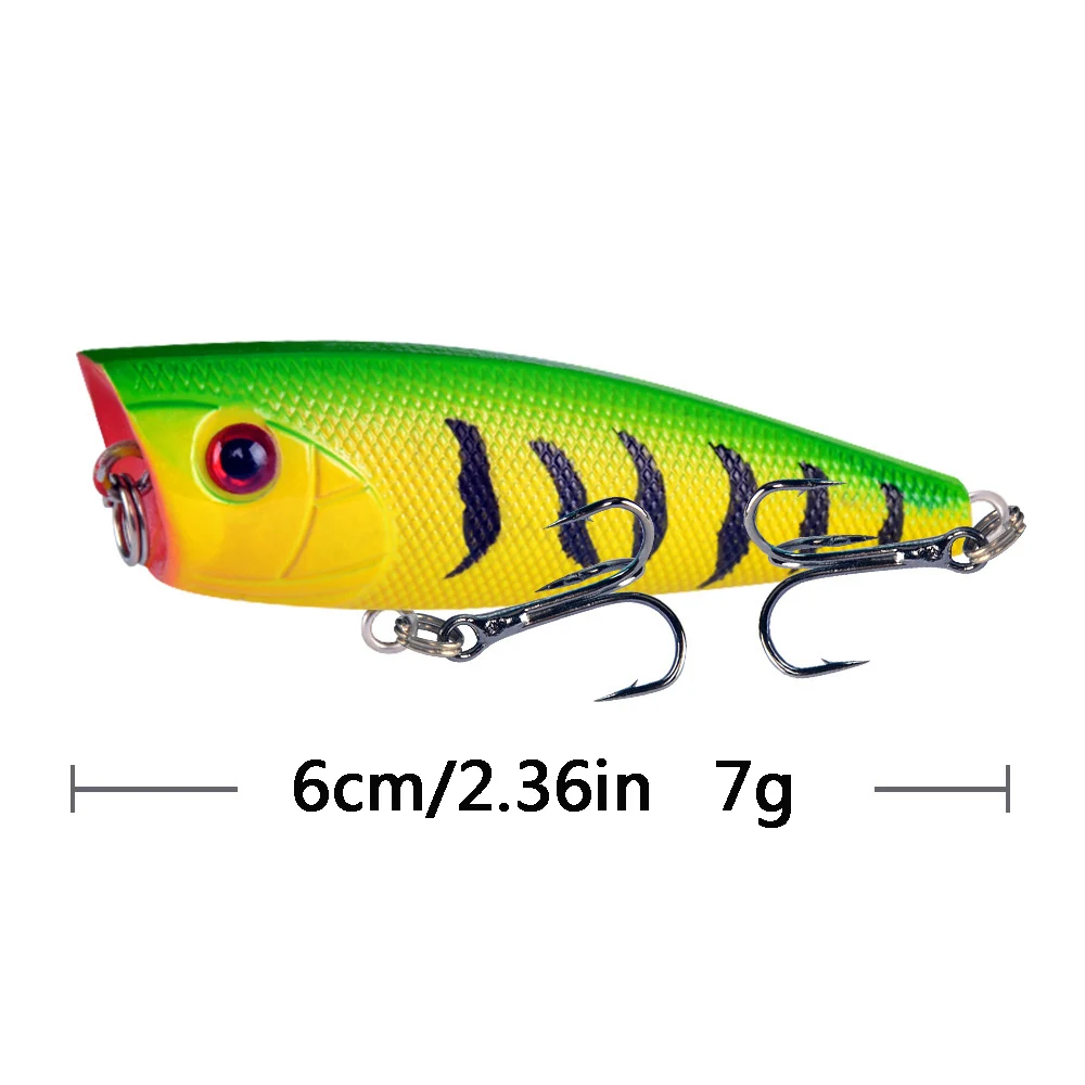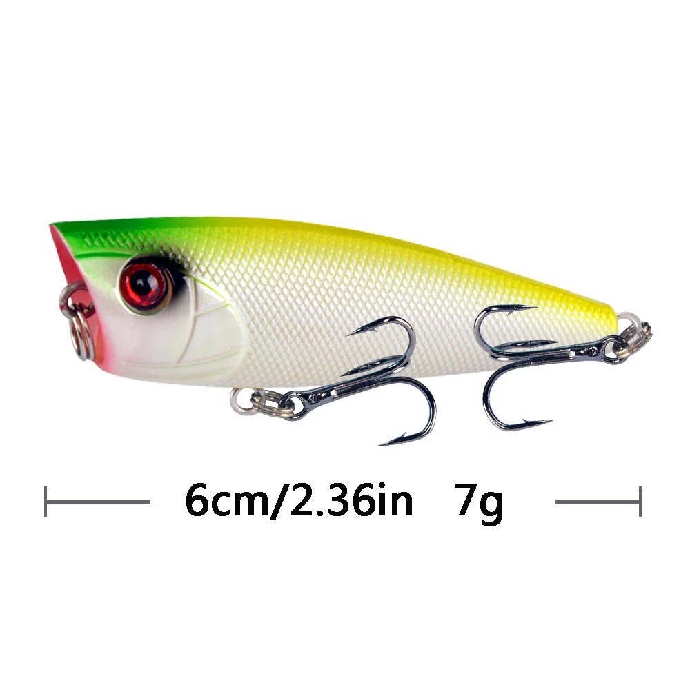 Color: Green - 1pc Popper Fishing Lure 6cm/6.5g Hard Bait Artificial Topwater Bass Trout Pike Wobbler Fishing Tackle with 2 Treble Hooks