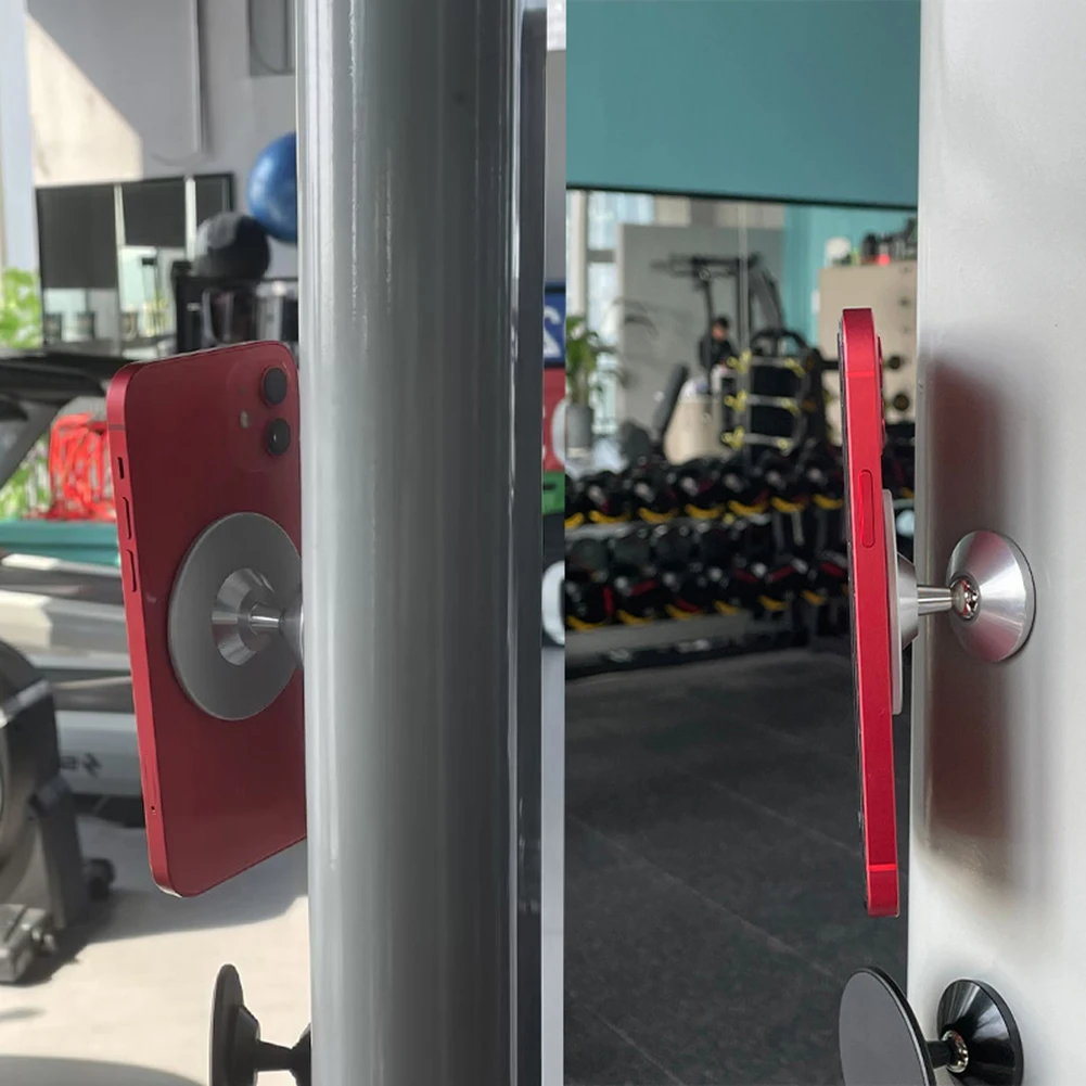Dual Magnetic Gym Phone Holder Anti Slip Universal GPS Mobile Phone Mount Walls Mirrors Doors Use for iPhone 14Pro Max Huawei Xiaomi Feature: 1. High Quality: Made of high-quality aluminum alloy, it has good ductility and wear resistance, avoiding breakage when dropped. Durable and can firmly support the phone. 2. Strong Suction: The dual magnetic suction head keeps your phone stable even on bumpy roads. Crazy shaking, easy to reach with one hand, unable to shake off. Whether it's the dashboard or windshield, there's no need to worry about falling. 3. 360 ° Rotation: 360 ° stereo angle adjustment can be achieved, allowing you to adjust your phone to any angle, ensuring that your phone is always in the best position. 4. Widely Applicable: Different from traditional adhesive models, it can be installed on various surfaces such as walls, mirrors, doors and windows, cars, etc., freeing hands; It is also a desktop phone stand, very suitable for homes, offices, kitchens, bedside tables, and more. 5. Strong Compatibility: Compatible for iPhone 14, 13, and 12 series Apple phones with magnetic pads. Except for iPhone 14, 13, and 12 series, other brand phone models can be used in multiple scenarios with magnetic pads Specification: Color: Silver/Black (optional) Material: Aluminum alloy+zinc alloy+silicone Process: CNC+anode+assembly Size: About 57.5x57.5x33mm/2.26x1.29inch Weight: 57g Note: ![]() 1 x Phone Holder