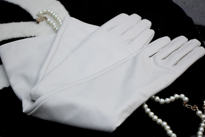 Color: green, Gloves Size: 3 - 50cm New Genuine Leather White Women's High Grade Party Mittens Sheepskin Lady Winter Velvet long Gloves Creamy Ivory Snow White