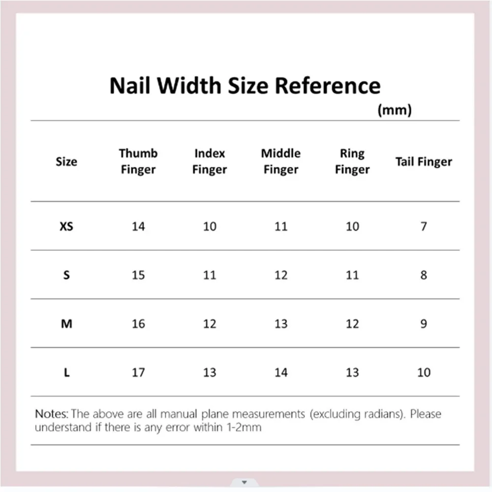 Firstly, when choosing to wear pressure nails, size must be the first choice, because wearing pressure nails is a finished product, and the seller does not know the size of your nail plate, so each person's pressure nail size is different. Generally speaking, there are four main types of nail sizes on the market. The XS/S/M/L four sizes are suitable for the vast majority of people.