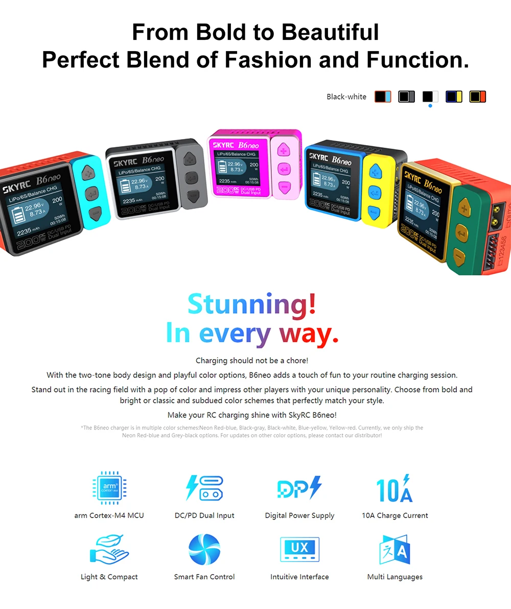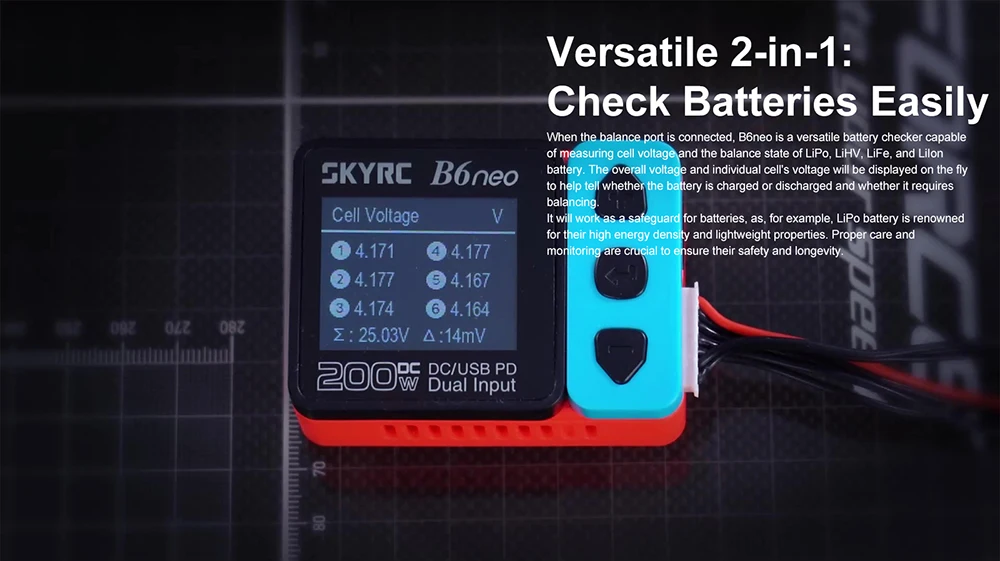 3.SkyRC B6neo features an XT60 interface as its DC input and a de-facto trendy Type-C PD input interface, ensuring greater flexibility and convenience in charging your RC batteries.