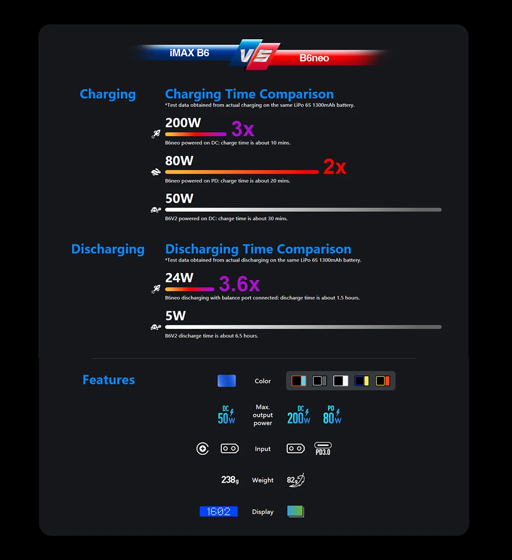 The built-in balance port enables B6neo to discharge faster, allowing it to discharge at up to 24W when used in conjunction with the main port. In contrast, the discharge rate when using the main port alone is limited to just 10W.
