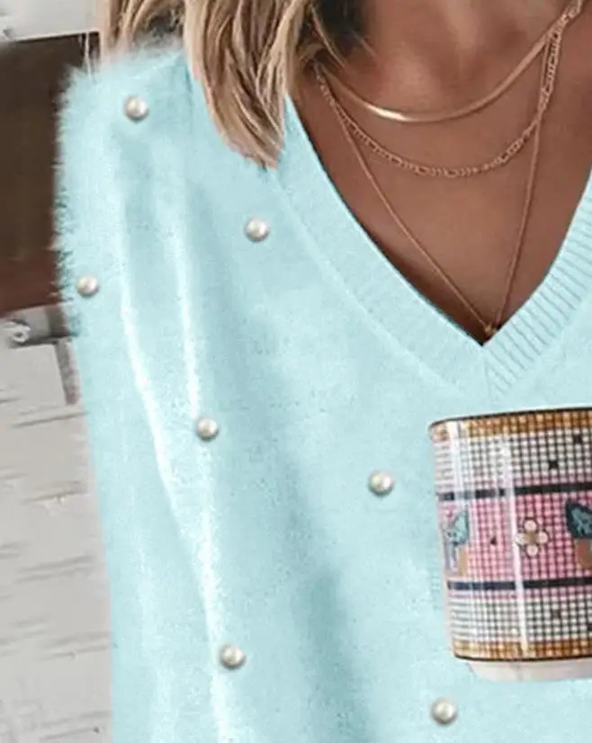 Korean Style Lazy Women's Sweater 2024 Autumn Ribbed Knitted Pullover V-Neck Pearl Long Sleeved Fluffy Top Women's Loose Sweater