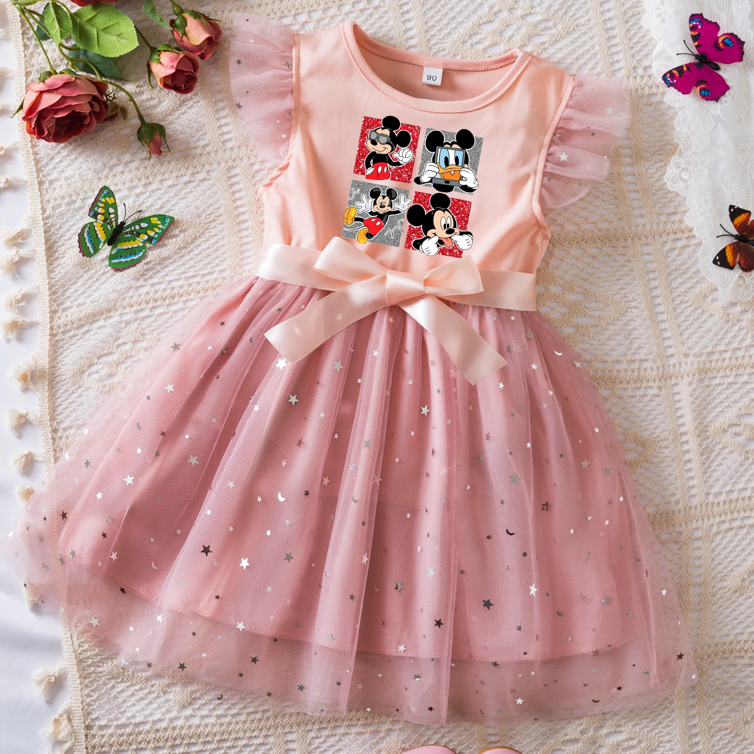 Color: green, Size: M - Mickey Minnie Mouse Girls Summer Clothes Flying Sleeves Bow Sequin Dress 2-6Y Kid Birthday Tutu Princess Dress for Baby Girl