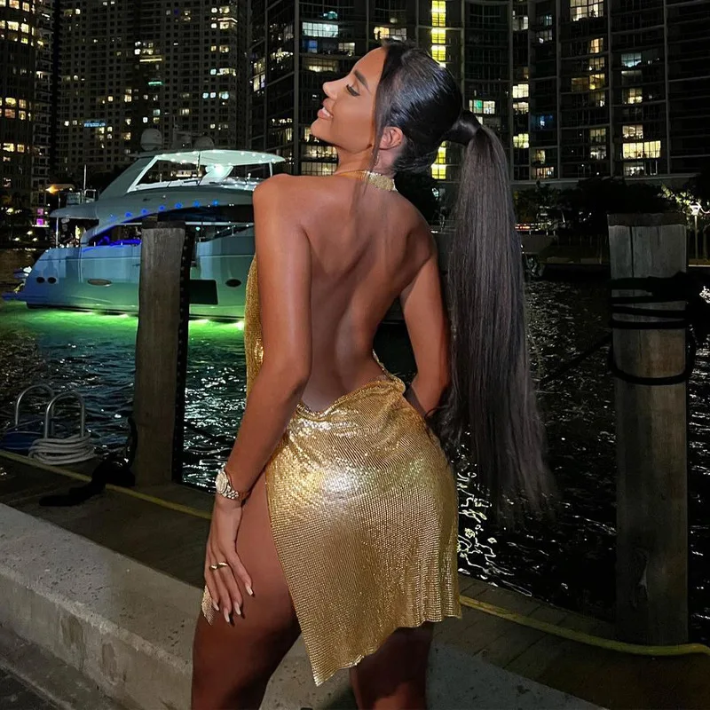 Color: green, Size: M - Sexy and Fashionable Women's Elegant Short Dress with Hanging Neck Backless Bottom Chest Sequin Party Girl Dance Dress