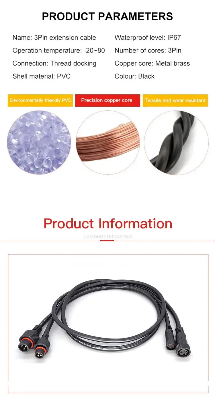 3Pin Waterproof Extension Cable 0.3/0.5/0.75/1.0/1.5/2.5 square meter Outdoor LED Plug Male to Female Aviation Power Connector