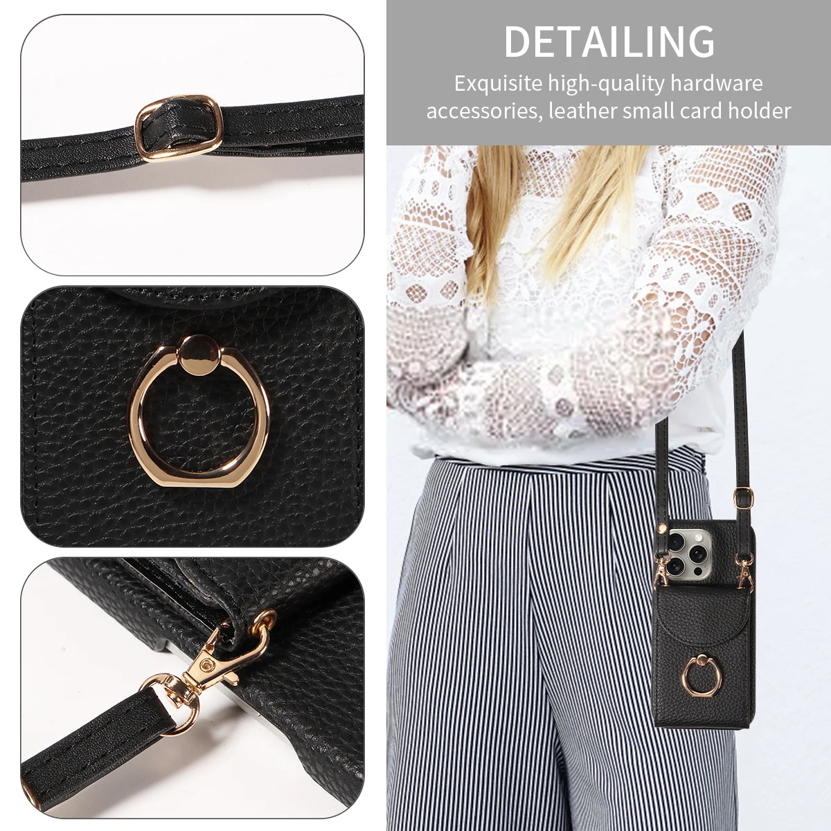 Color: Khaki, Compatible-Phone Models: For iPhone 13, Bundle: Case & Strap, Material: Artificial Leather - High Quality Ring Stand Lychee Pattern Phone Case for IPhone16promax15 14 13 Crossbody with Lanyard PU Leather Anti-fall Cover
