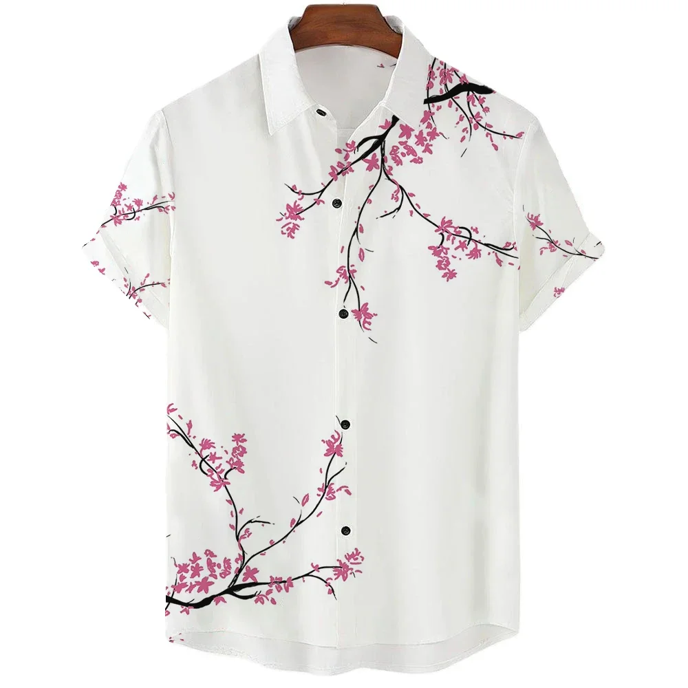 Color: Khaki, Size: XL - Fashionable Luxury Social men's Shirt Lapel button-down Shirt Casual Japanese Aesthetic Cherry Blossom Print short-sleeved Tops