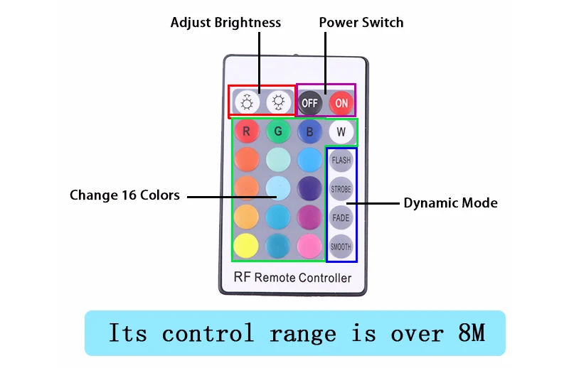 1. Come with RF remote control for color change, flash pattern change and bright/dim change.