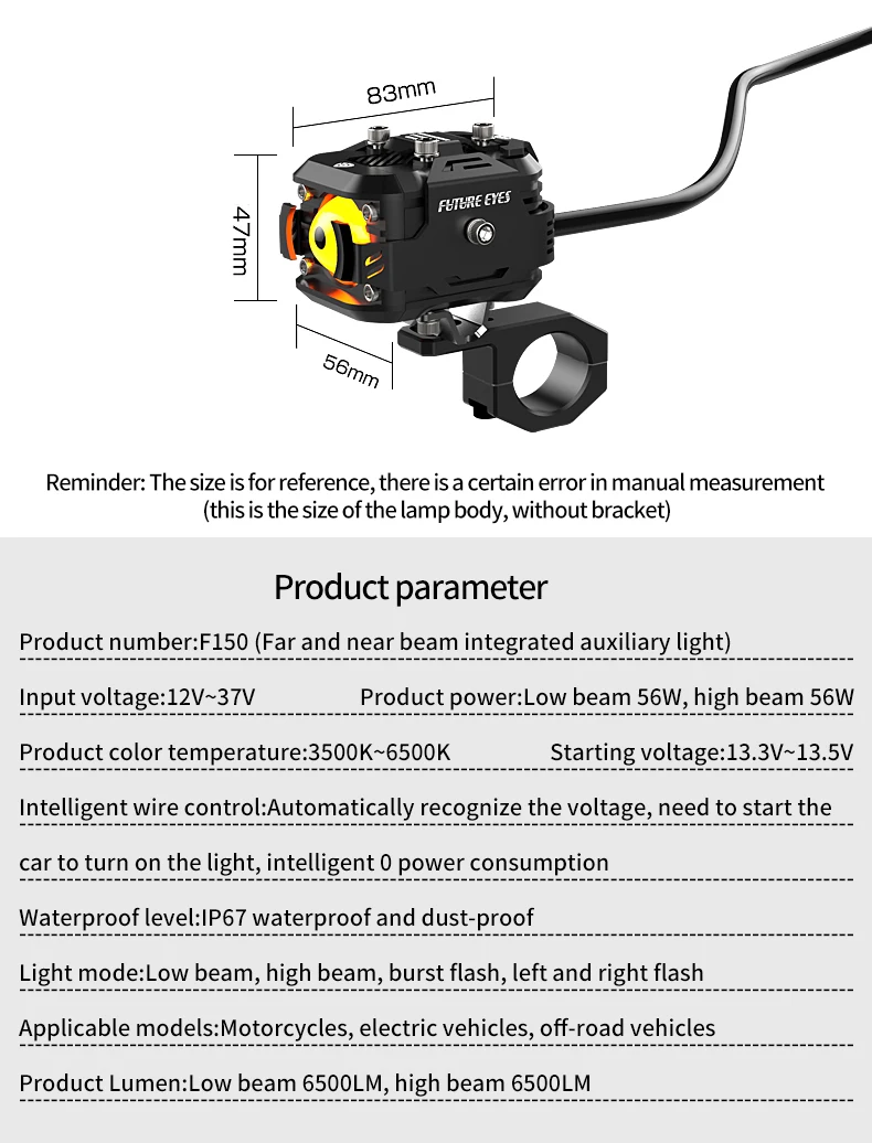 12V-37V motorcycles or electric scooters or bicycles, etc., can be installed with F150 spotlights