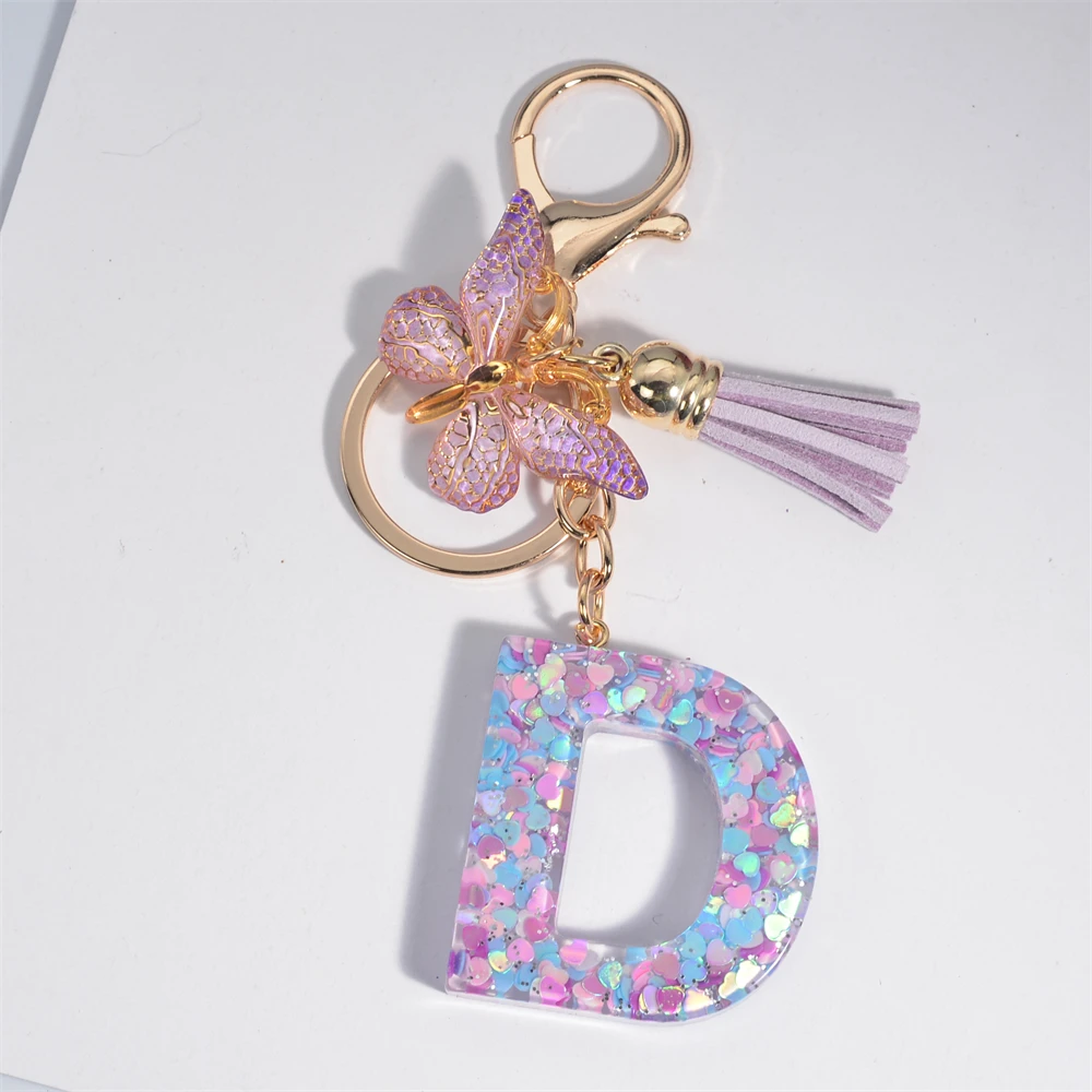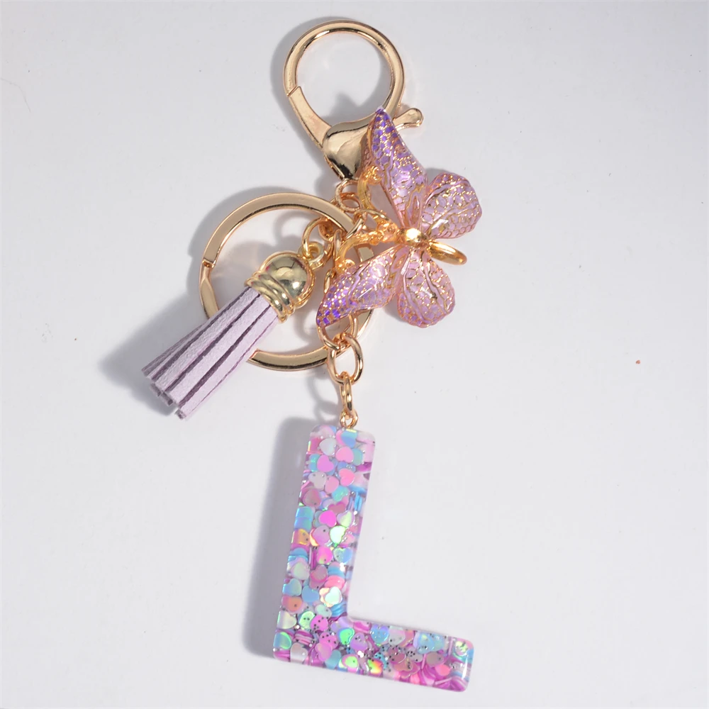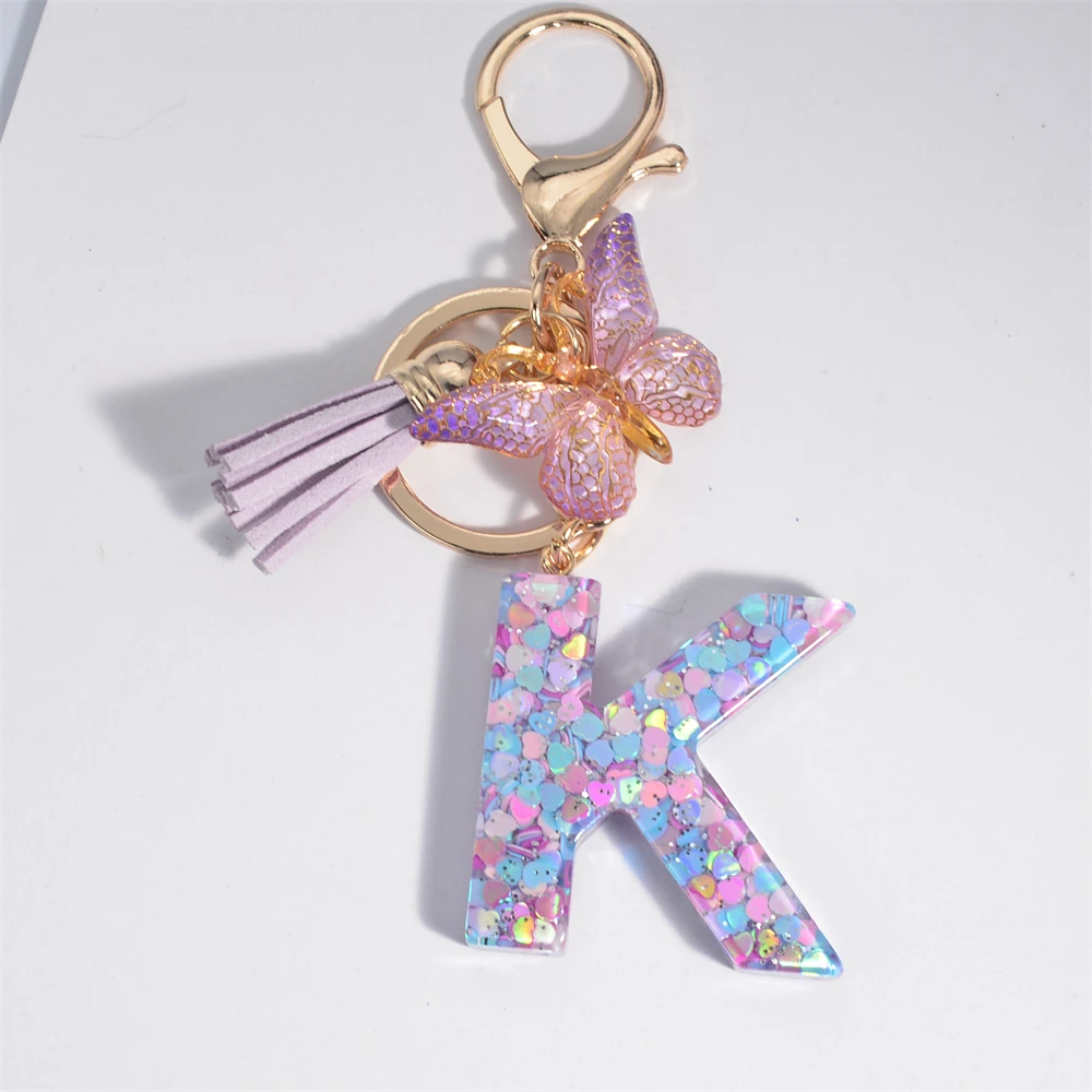 Color: Light Blue - Fashion Tassel Butterfly 26Letter Keychain Colorful Love Heart Filled Resin Alphabet Keyring Women Girls Car Bag Phone Pendant