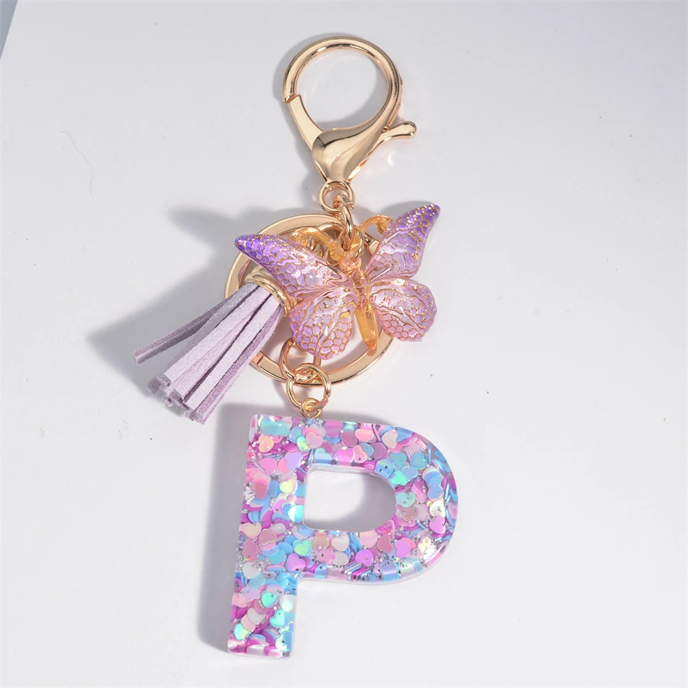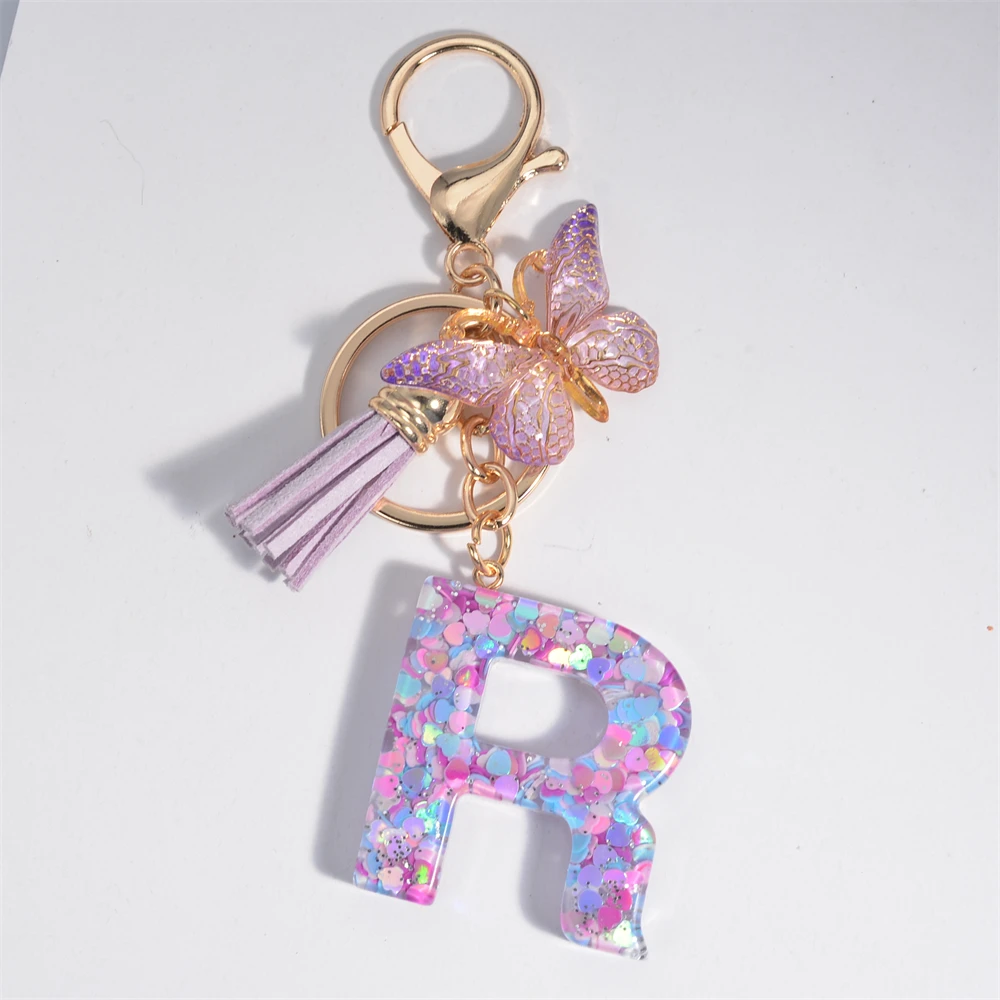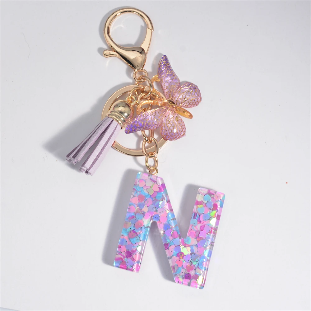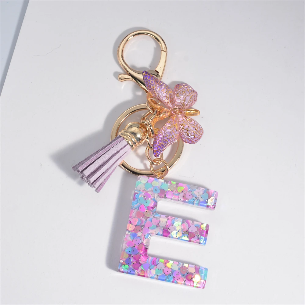 Color: Light Blue - Fashion Tassel Butterfly 26Letter Keychain Colorful Love Heart Filled Resin Alphabet Keyring Women Girls Car Bag Phone Pendant
