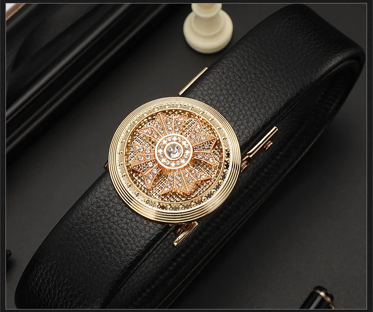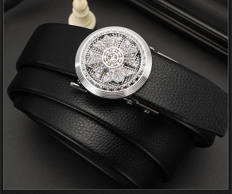 Color: Light Grey, Belt Length: 120cm - Man PU Leather Belt High Quality Men Business Belt Golden Automatic Buckle Waist Buckle Rhinestone Decoration Males Luxury Belt