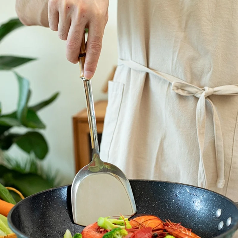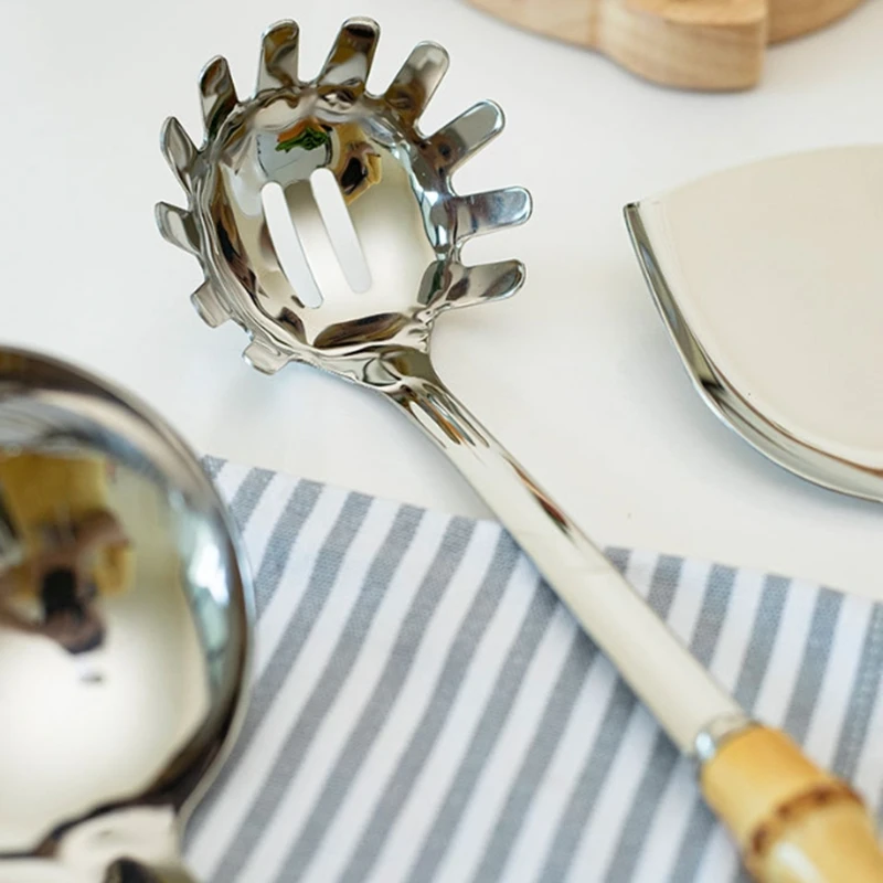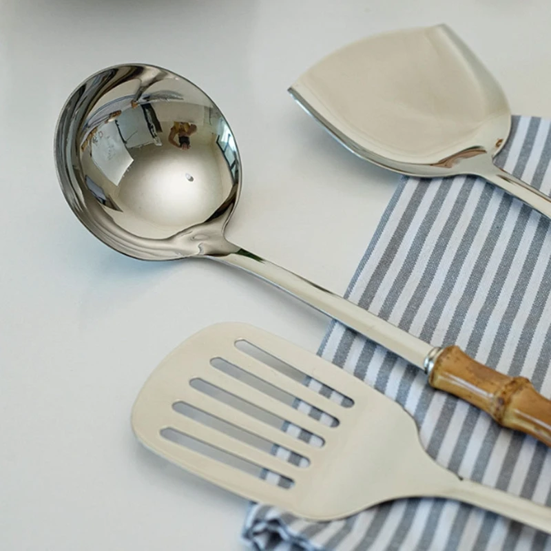 Color: light yellow - Natural bamboo handle stainless steel frying shovel Japanese-style soup spoon Creative new colander shovel kitchen utensils set