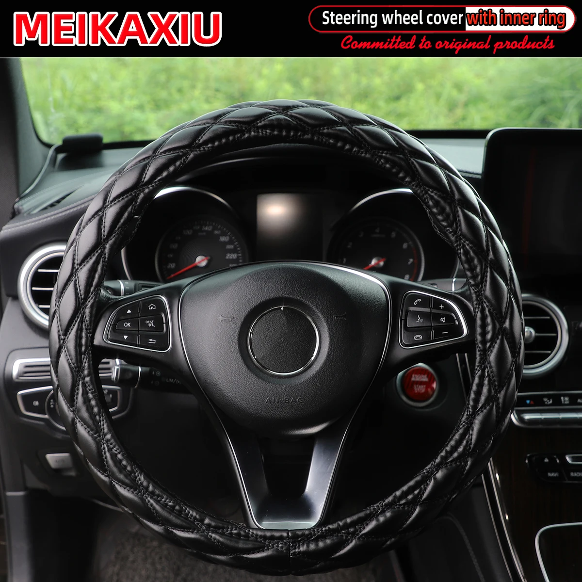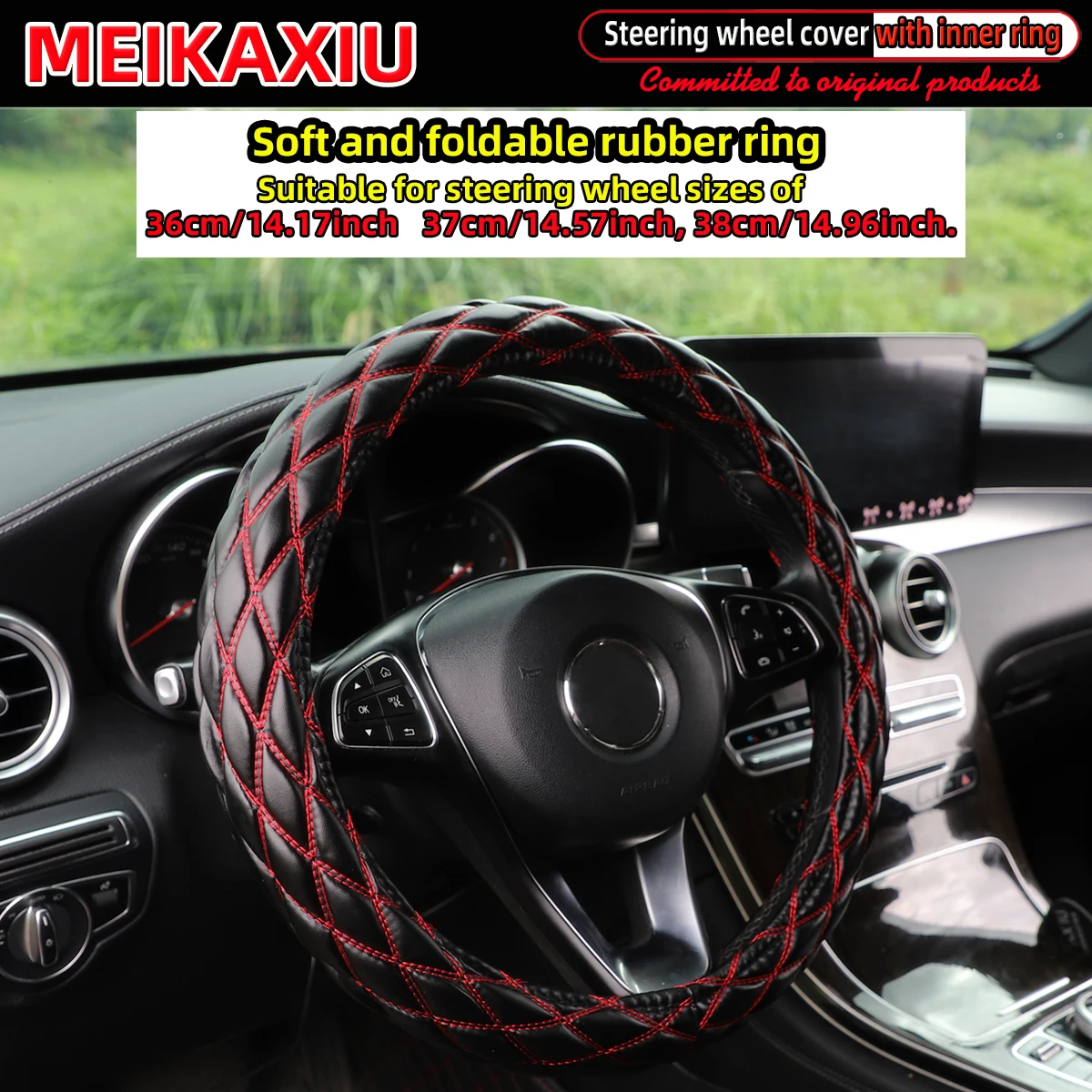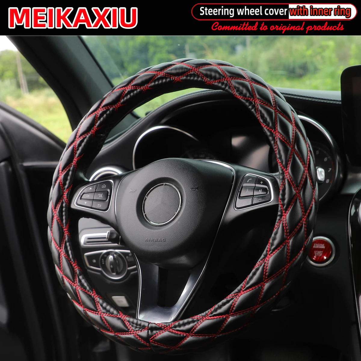 Color Name: Red - New PU sheepskin embroidered double-thread car has an inner ring steering wheel cover suitable for 36cm, 37cm and 38cm