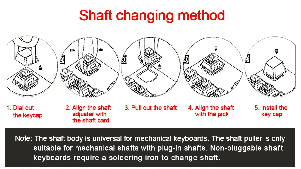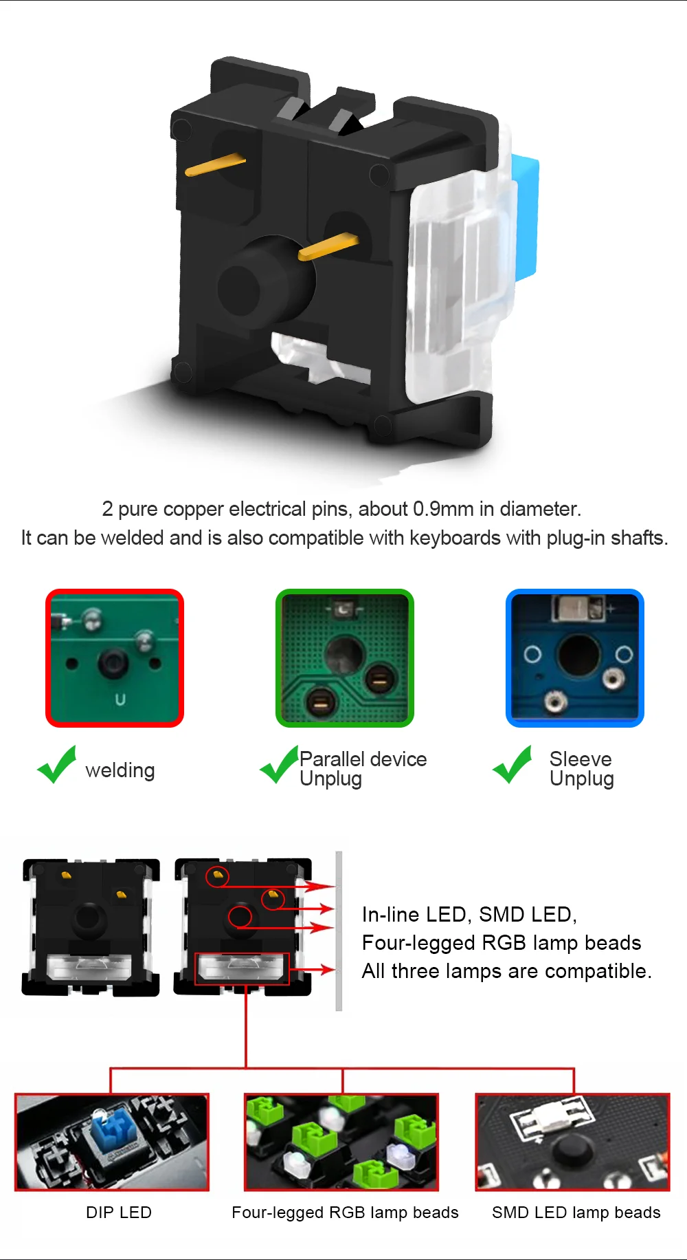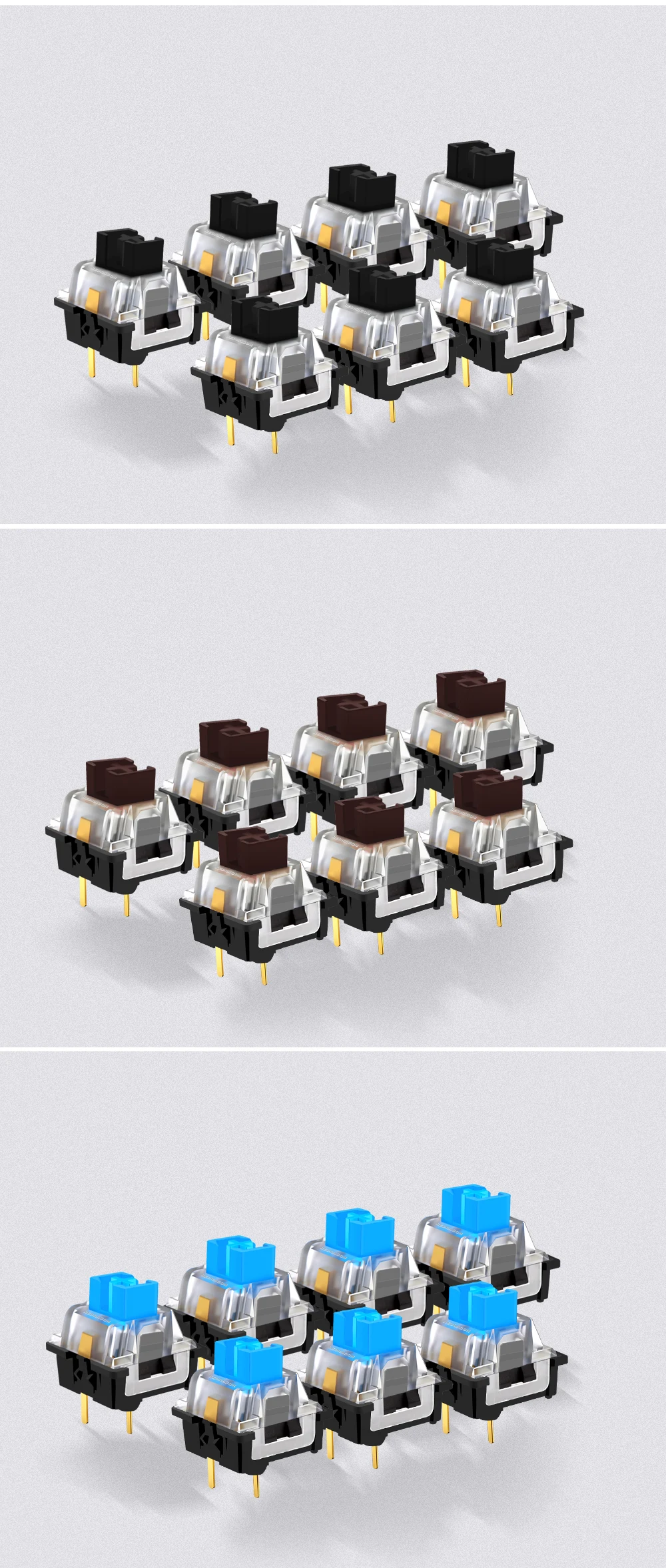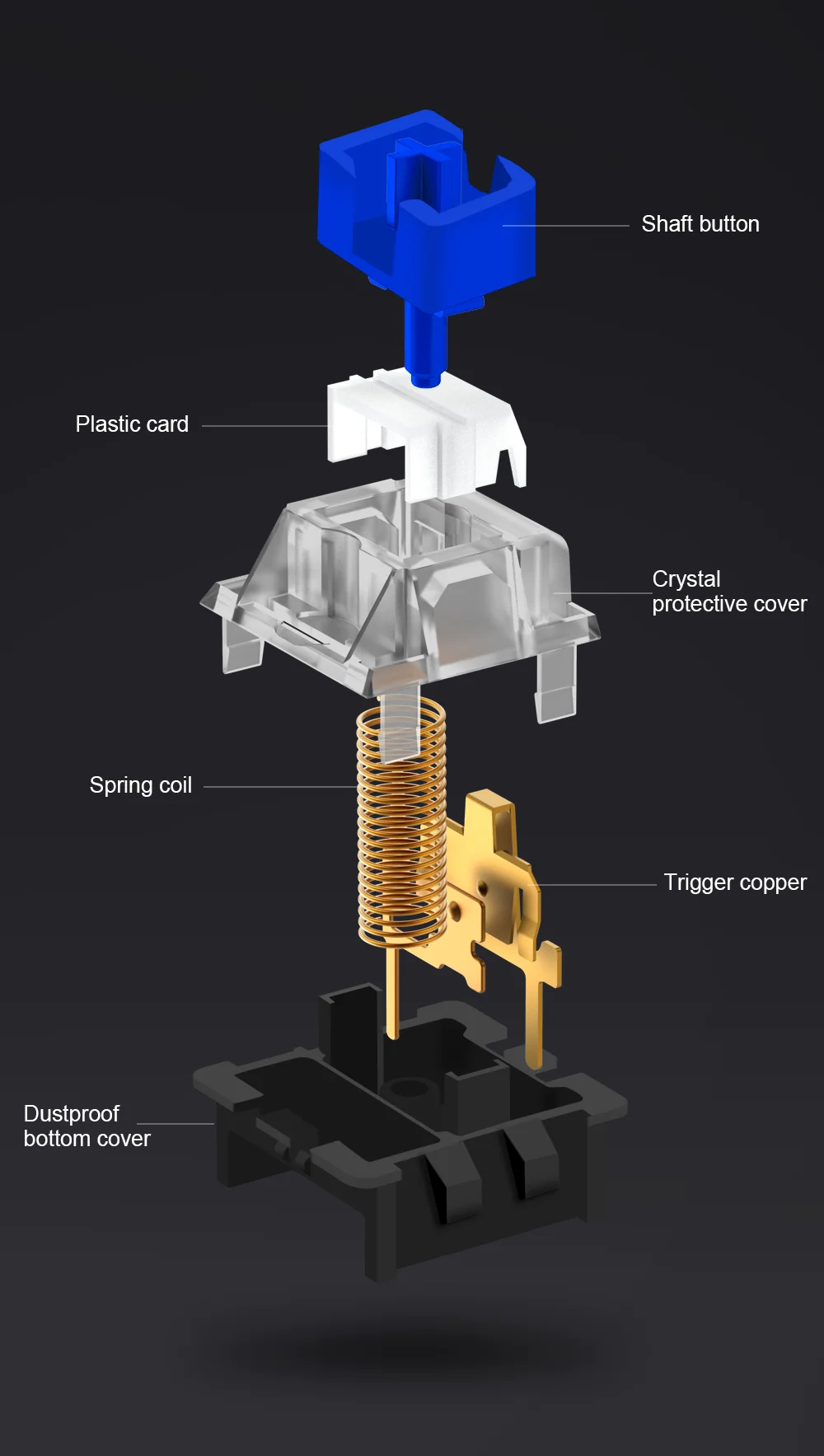 Descriptions: The linear switching characteristic combined with the low spring resistance triggers directly. The Red Switch is the first choice for beginners in the world of mechanical keyboards.The smooth-running enables balanced writing and gaming sessions.