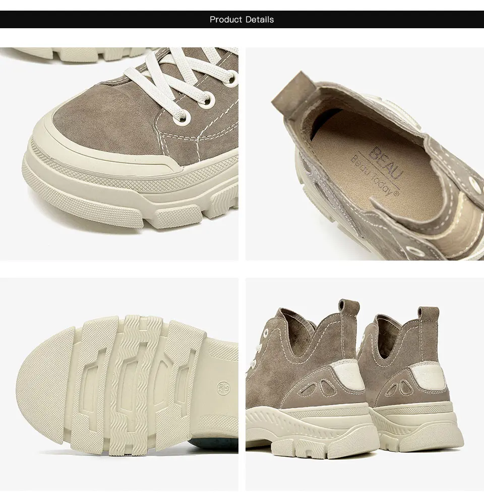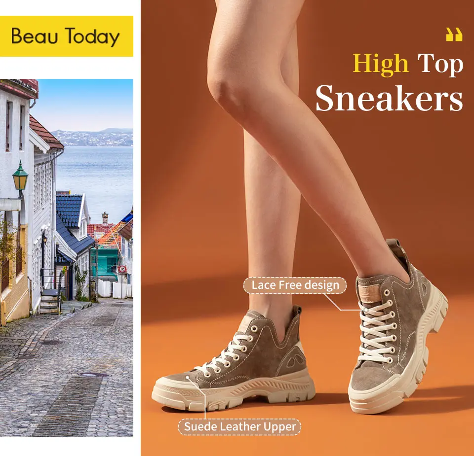 Color: Orange, Shoe Size: 9 - BeauToday Casual Sneakers Women Suede Leather Round Toe Lace-Free High Top Ladies Retro Fashion Flat Shoes Handmade 29575
