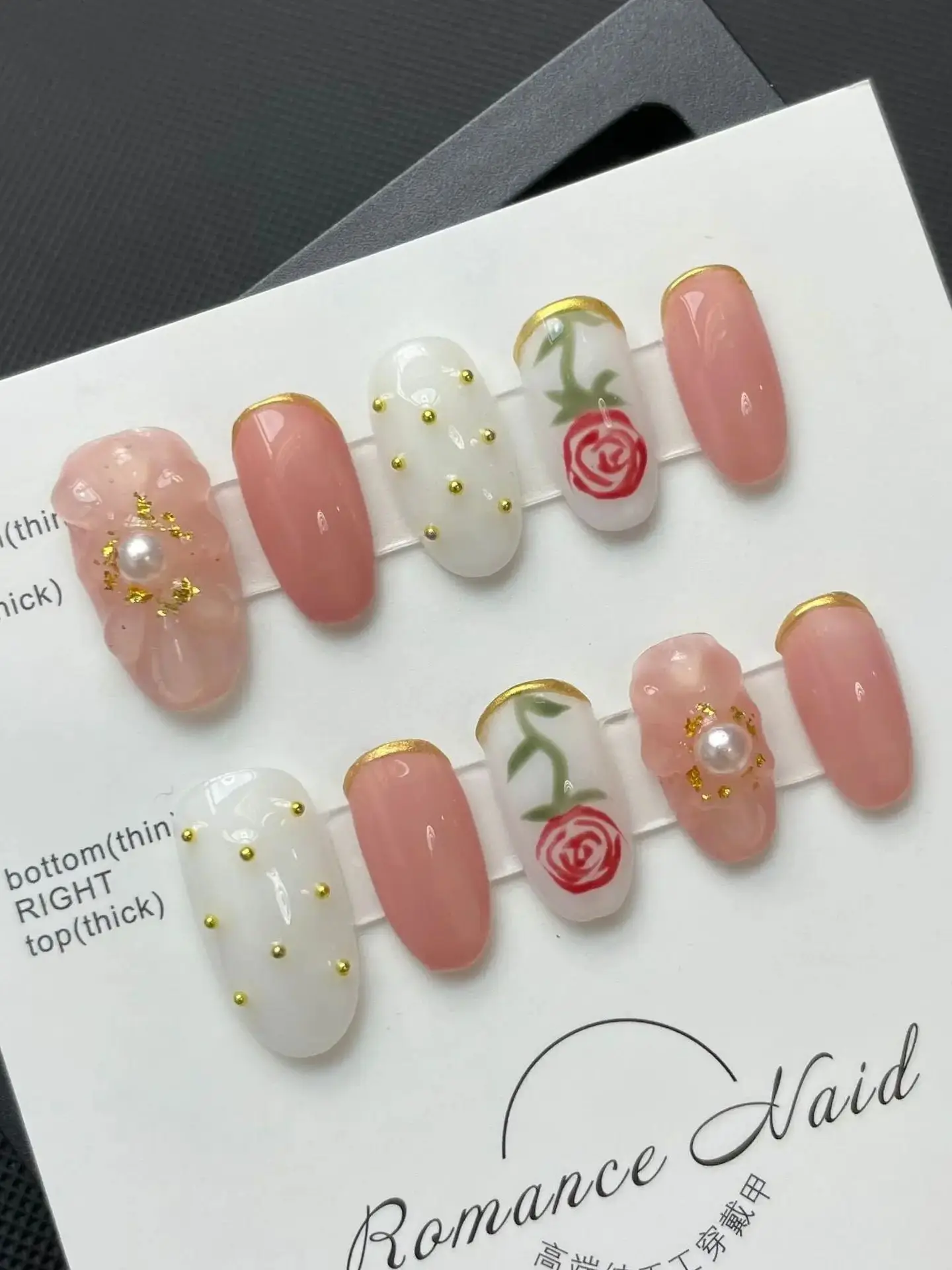 Color: Pink - 10 pcs Luxury Handmade Press on Nails Middle Ellipse Pink Tulip Design False Nails with 4-PIECE Tool Adhesive Nail Glue Tabs