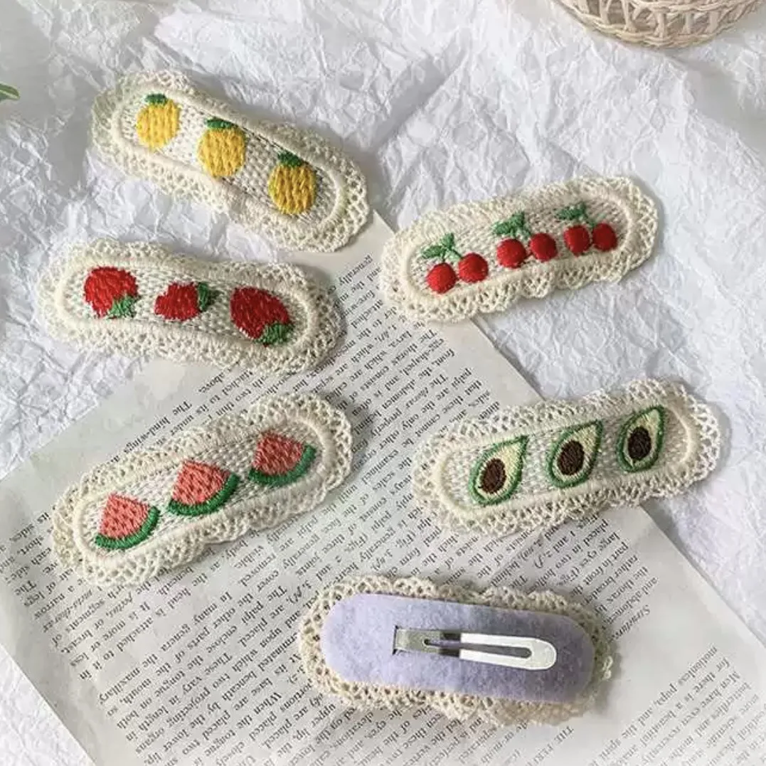 Color: Pink - 2Pcs Sweet Girl Embroidery Hairpin Lace Side Clip Cute Kids Hair Ornament Pastoral Style Fruit Pattern Headwear