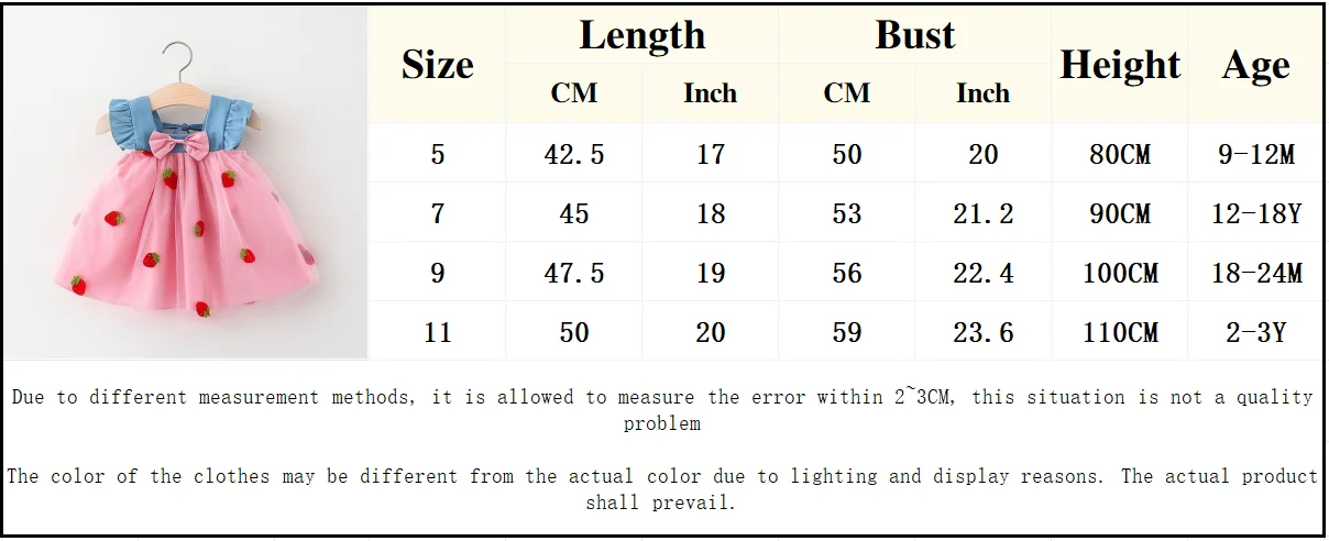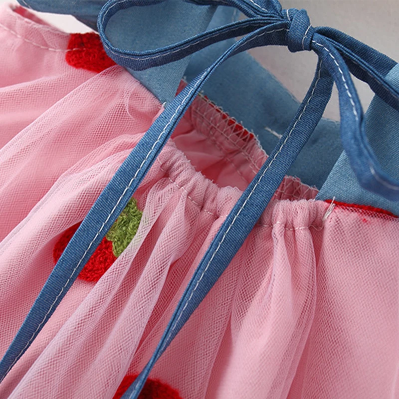 Color: Pink, Kid Size: 9M - Summer girl dress baby girl small flying sleeves denim top with patchwork strawberry embroidery mesh suspender princess dress