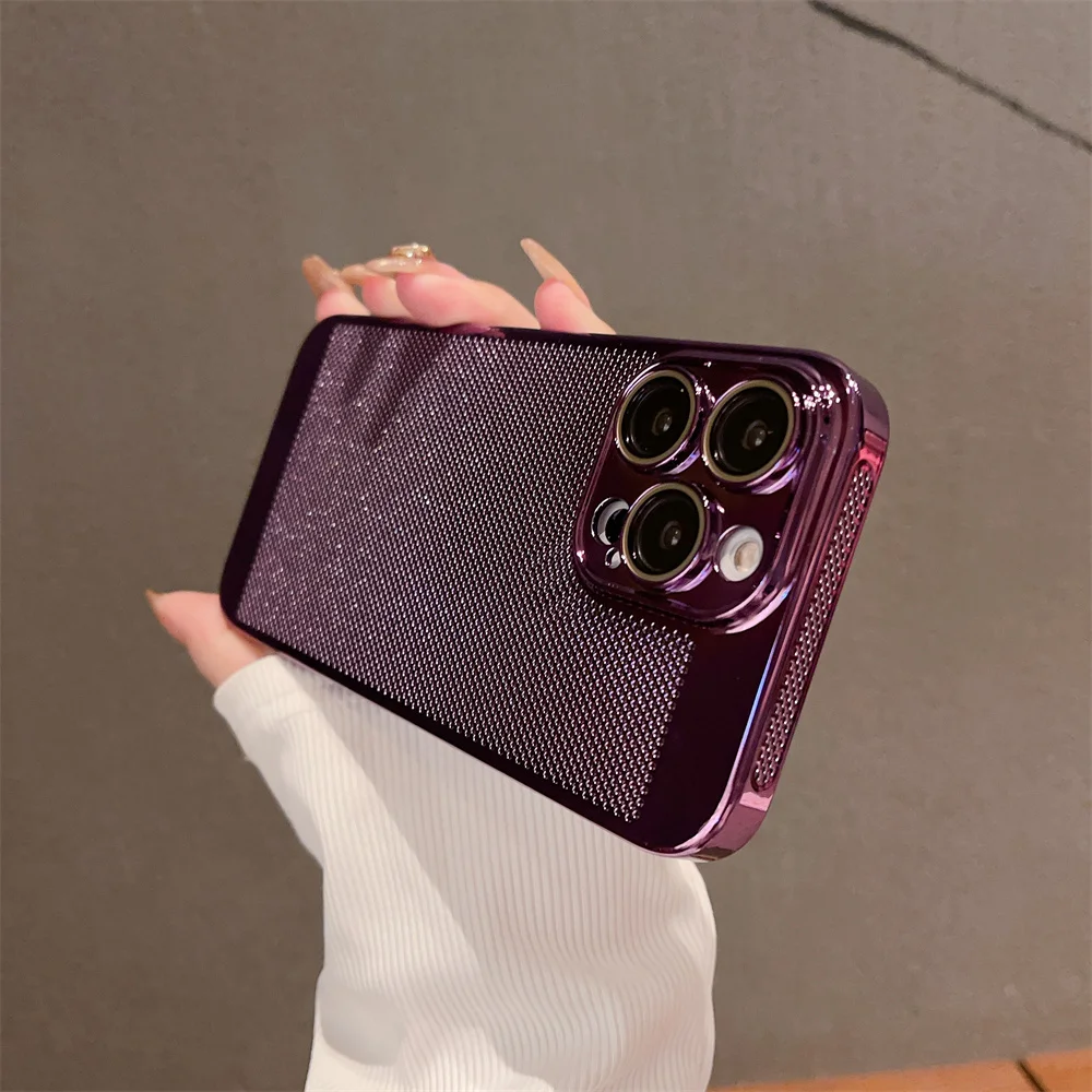 Color: Pink, Material: plastic - Luxury Plating Hollowed Out Case for iPhone 12 13 Mini 11 14 Pro Max X XR Xs Max 7 8 Plus Heat Dissipation Shockproof Lens Cover