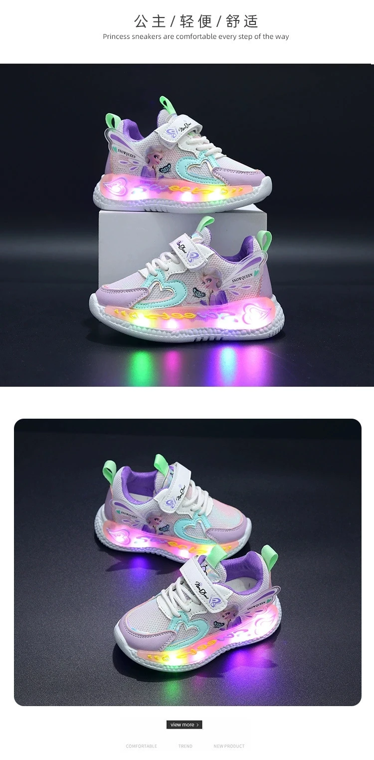 Color: Pink, Shoe Size: 23 - Disney Children Led Shoes Kids Girls Sneakers Frozen Elsa Princess Lighting Shoes Pink Purple Casual Sports Shoes Size 21-31