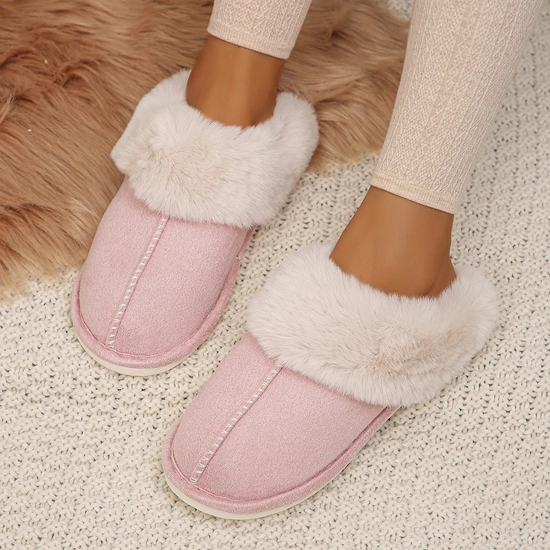 Color: Pink, Shoe Size: 44 - Closed Toe Warm Cotton Slippers Women Faux Fur Thicken Plush Winter Home Shoes Woman Lightweight Casual Indoor Slides Female